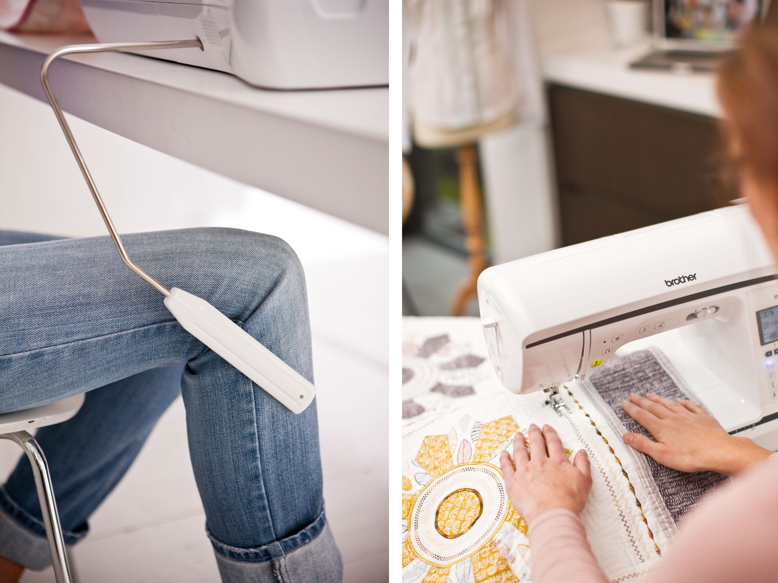 Mit Kniehebel - die Hände bleiben beim Stoff. Nähfuß senken und heben einfach mit einem leichten Kniedruck. Ideal für große Teile, beispielsweise beim Quilten.
