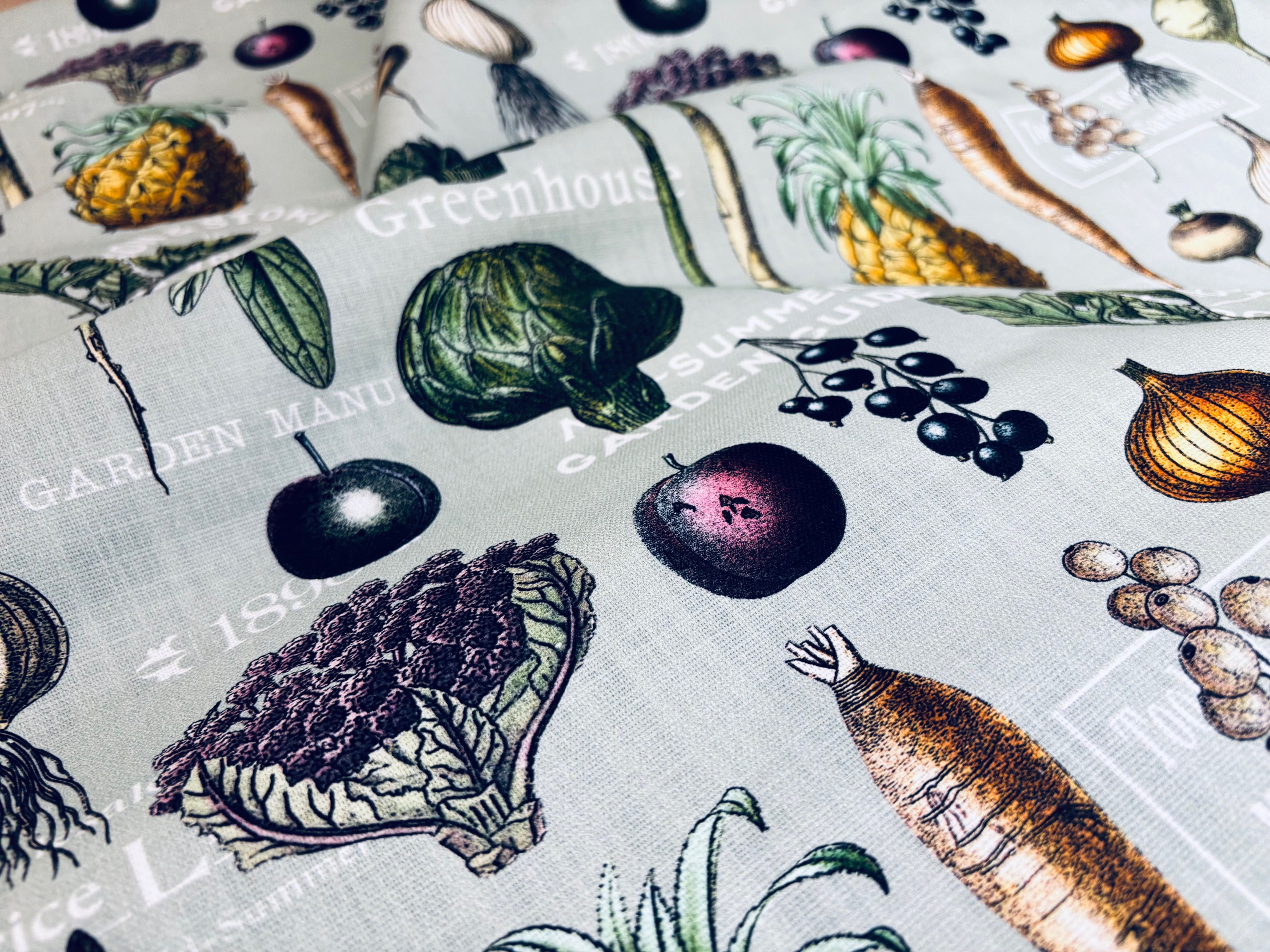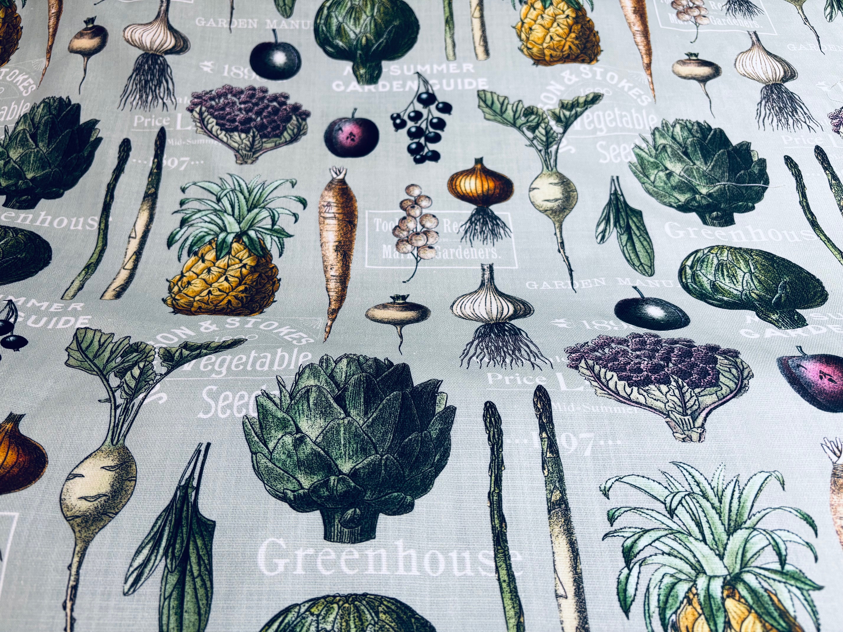 Modernes Küchenflair im Landhausstil - Ob Rüben, Zwiebeln, Spargel, Artischocke, Beeren, Pflaumen - alles auf einem Stoff. In wunderbaren Farben auf graugrünem Untergrund. Schöner wohnen! Für Vorhänge, Schürzen, Taschen, Kissen, Heimtextilien aller Art. Leichterer Canvas, 100% Baumwolle, 160 cm breit. Impression de Nature.