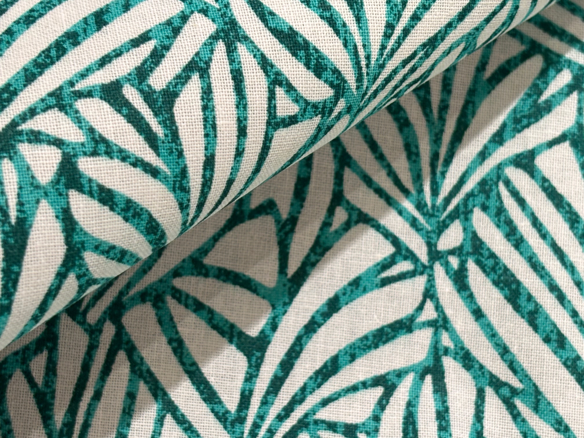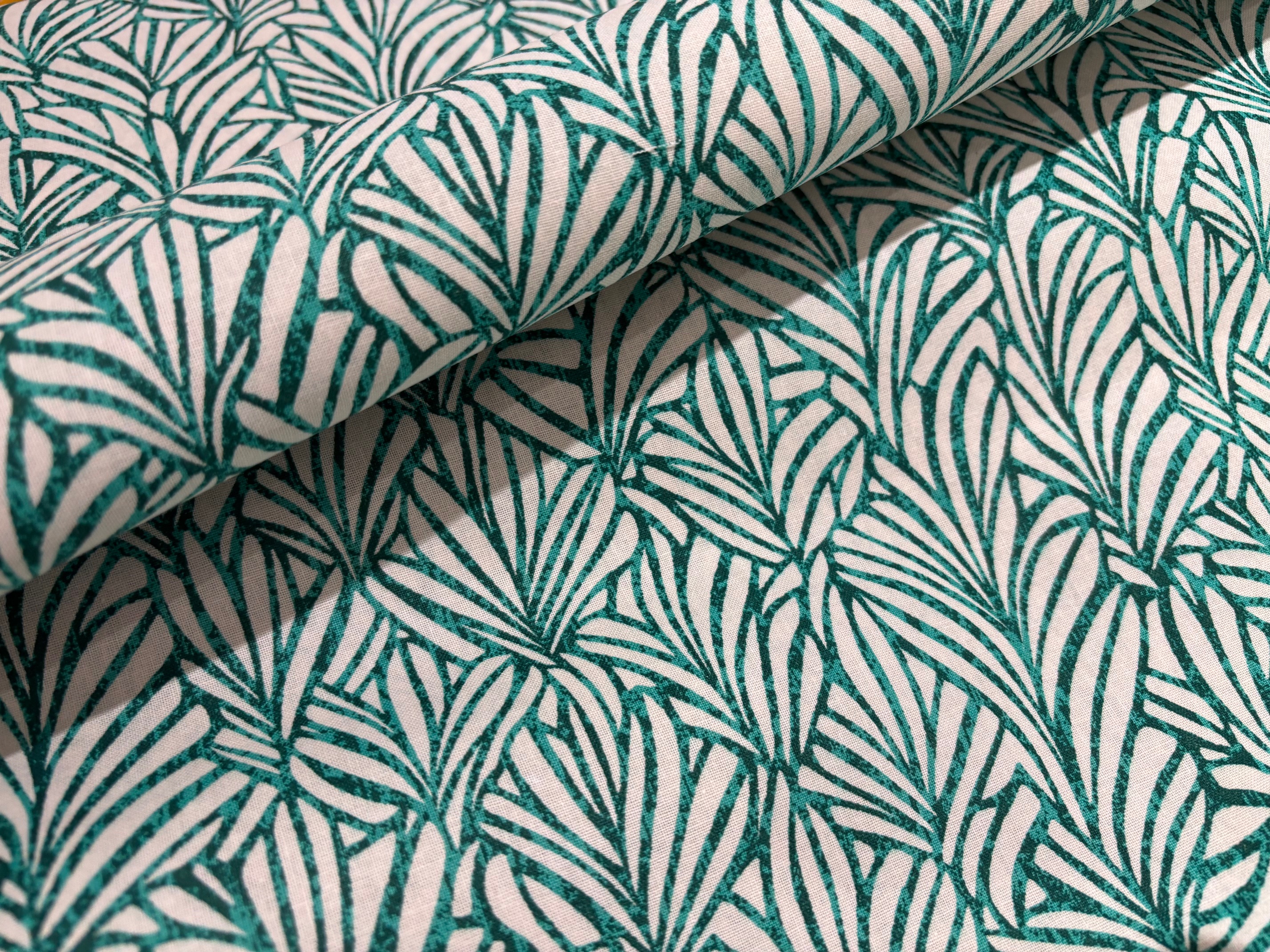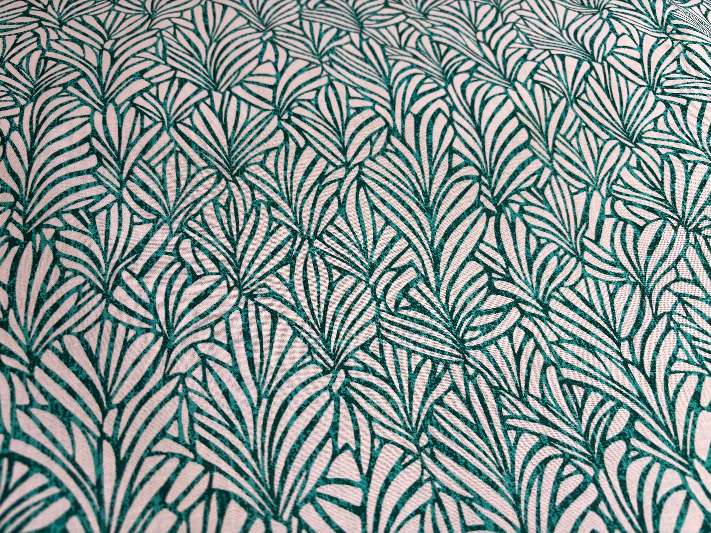 Schöne Ornamentik wie ein Scherenschnitt, in dunklem Mintgrün/Aqua meliert auf Weiß. Zeitloses, ästhetisches Design, toll für Taschen, Polster, Kissen, Vorhänge, modische Accessoires und vieles mehr. 100% Baumwolle in festerer Qualität. 160 cm breit. 140 g/m²