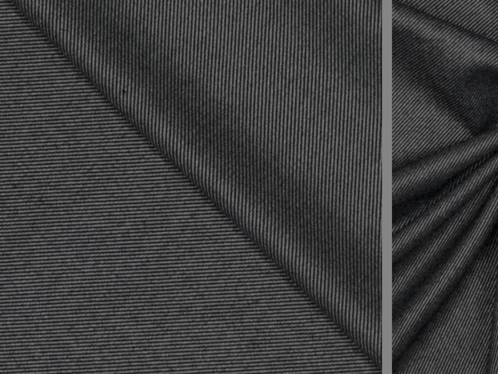 Fein gestreift, dunkles Grau. Edler, lässiger Look. Dieser nachhaltige und weiche Stoff besteht aus 50% Bambus und 50% recyceltem Polyester. Mit einem Gewicht von 240 g/m² und einer Breite von 150 cm ist dieser OEKO-TEX STANDARD 100 zertifizierte Stoff besonders gut geeignet für bequeme Mode, wie Blusen, Hosen, Röcke oder Kleider. Der Stoff fühlt sich seidig weich an, ist atmungsaktiv und umweltbewusst.