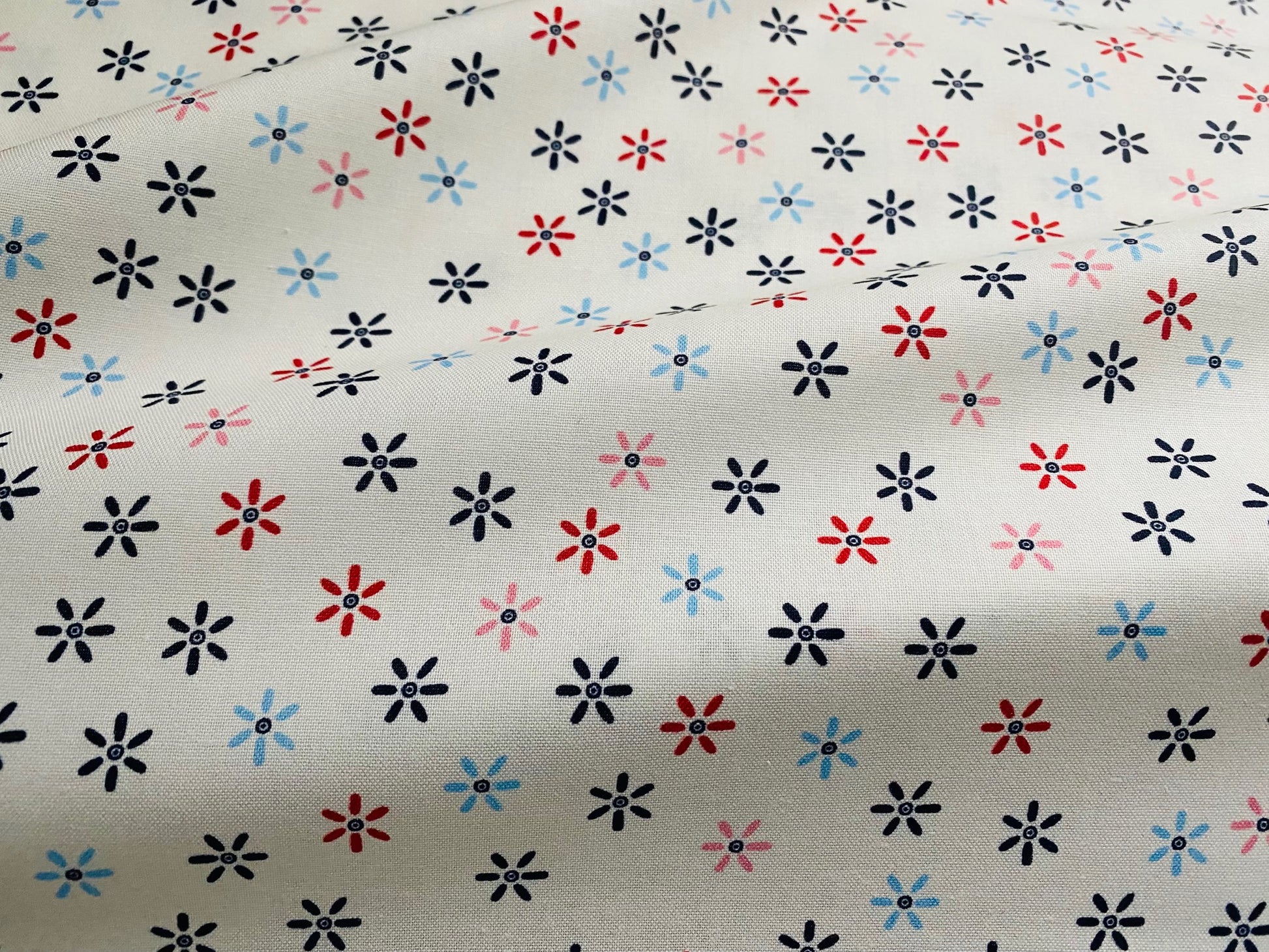 Blümchenzauber (1 cm) in Rosa, Hellblau, Rot und Dunkelblau auf Naturweiß. Zeitloses Design für charmante selbstgenähte Kreationen. So pur, so schön, so scandinavisch. 100% Baumwolle, 110 cm breit. Von Stoffabrics.