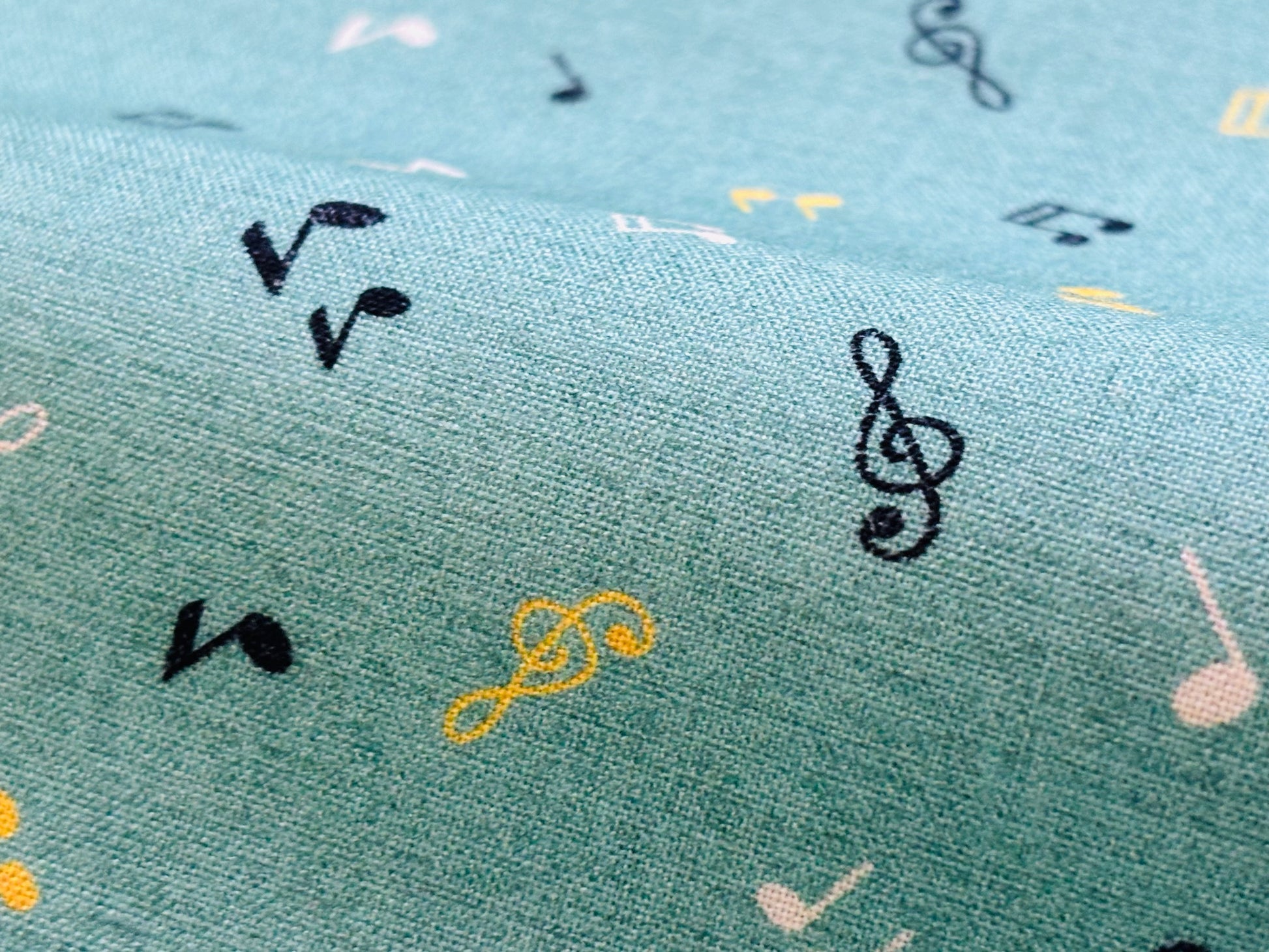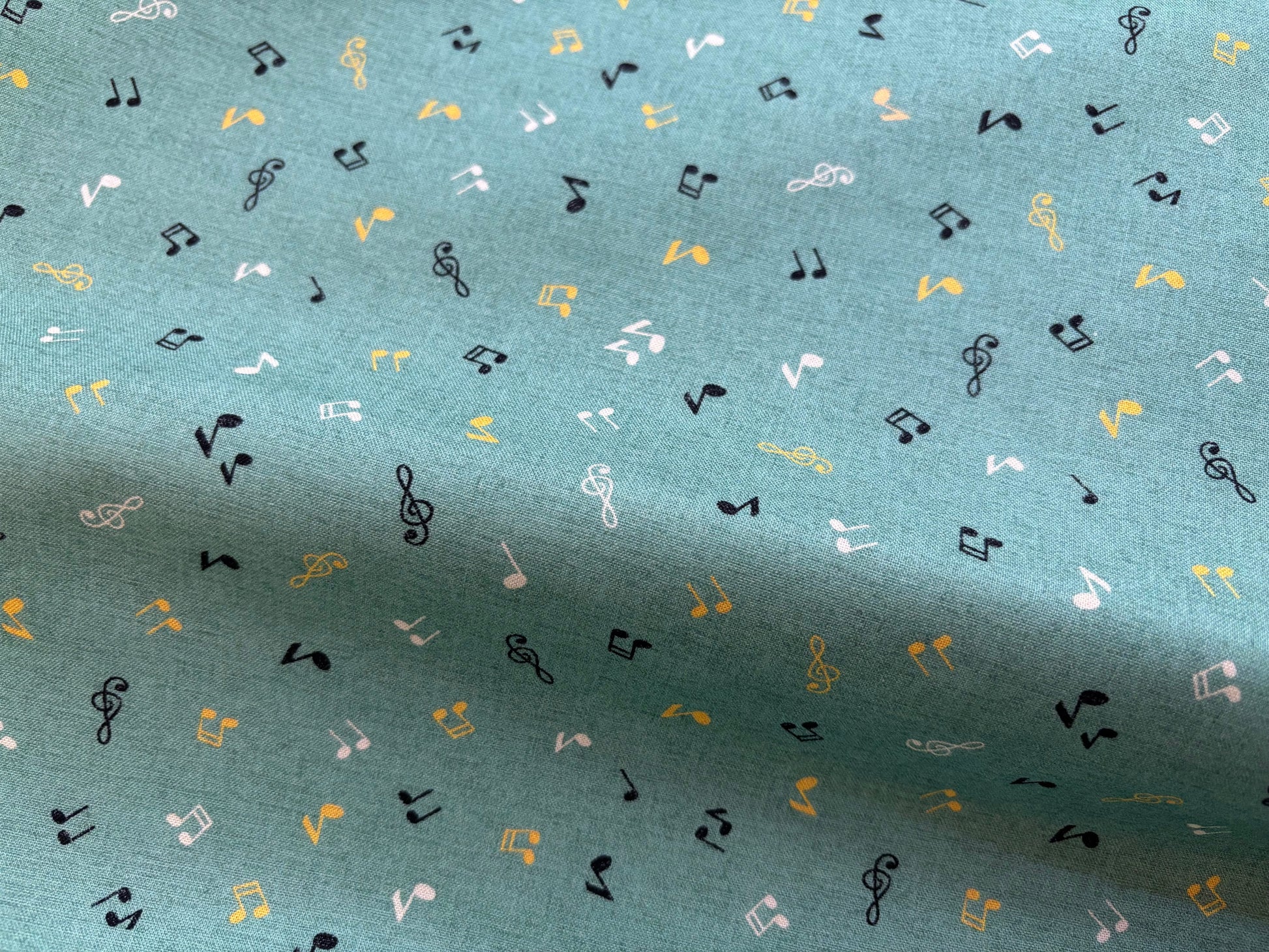 Kleine Musiknoten (1cm) in Schwarz, Weiß und Gelb fliegen auf diesem schönen Stoff herum. Untergrund in meliertem Mintgrün. Ein Stoff, der Musikerherzen höher schlagen lässt. 110 cm breit, 100% Baumwolle.