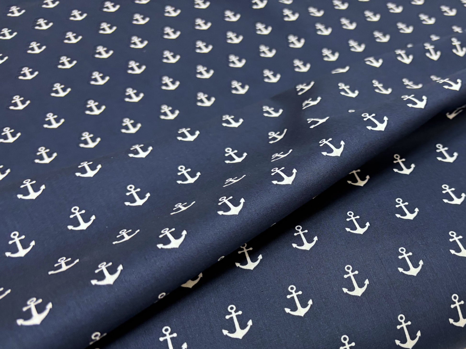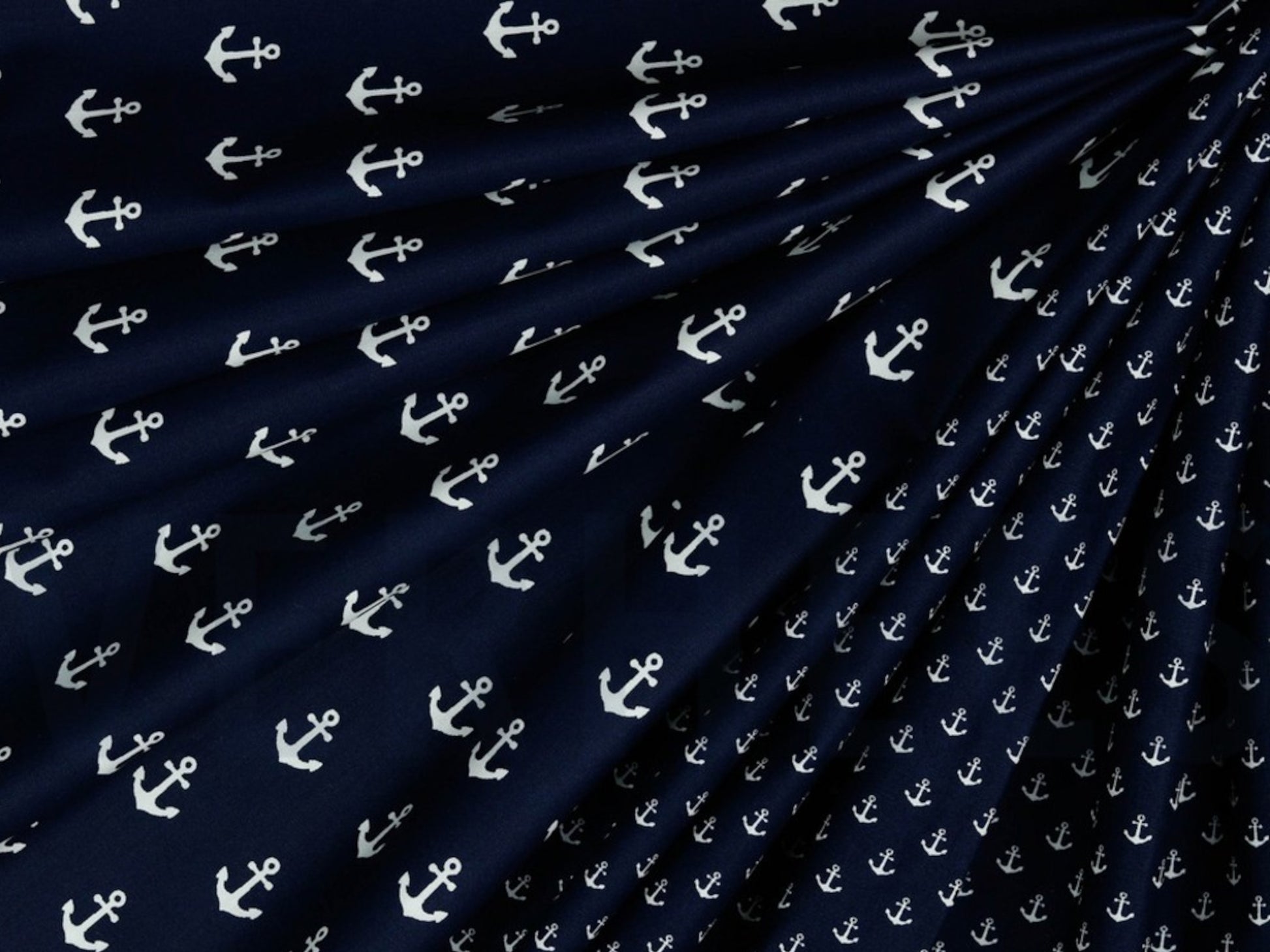 Maritimer Baumwoll-Druck von Poppy mit weißen Ankern (2 cm hoch) auf Dunkelblau, 100% Baumwolle, Popeline 150 cm breit