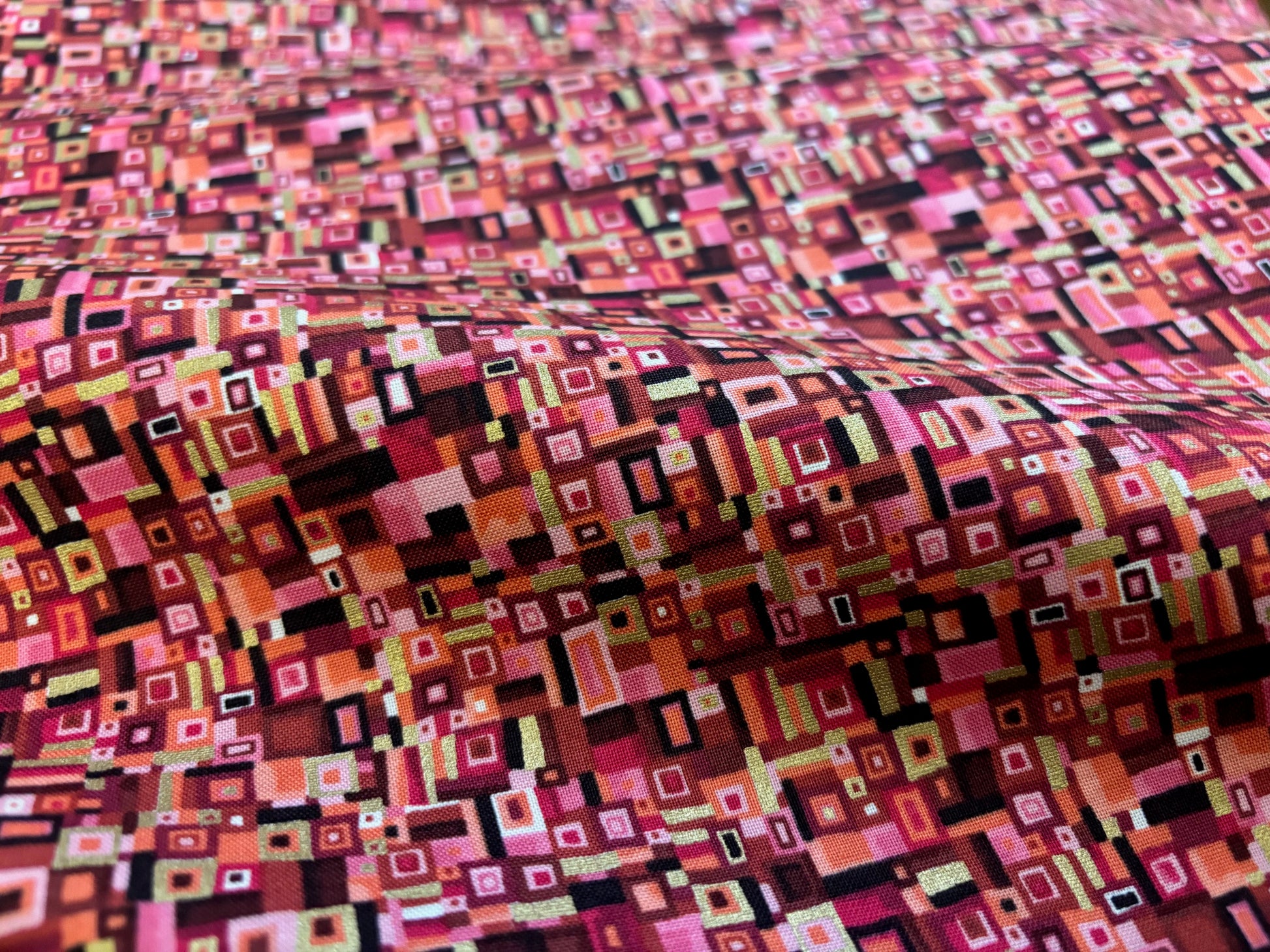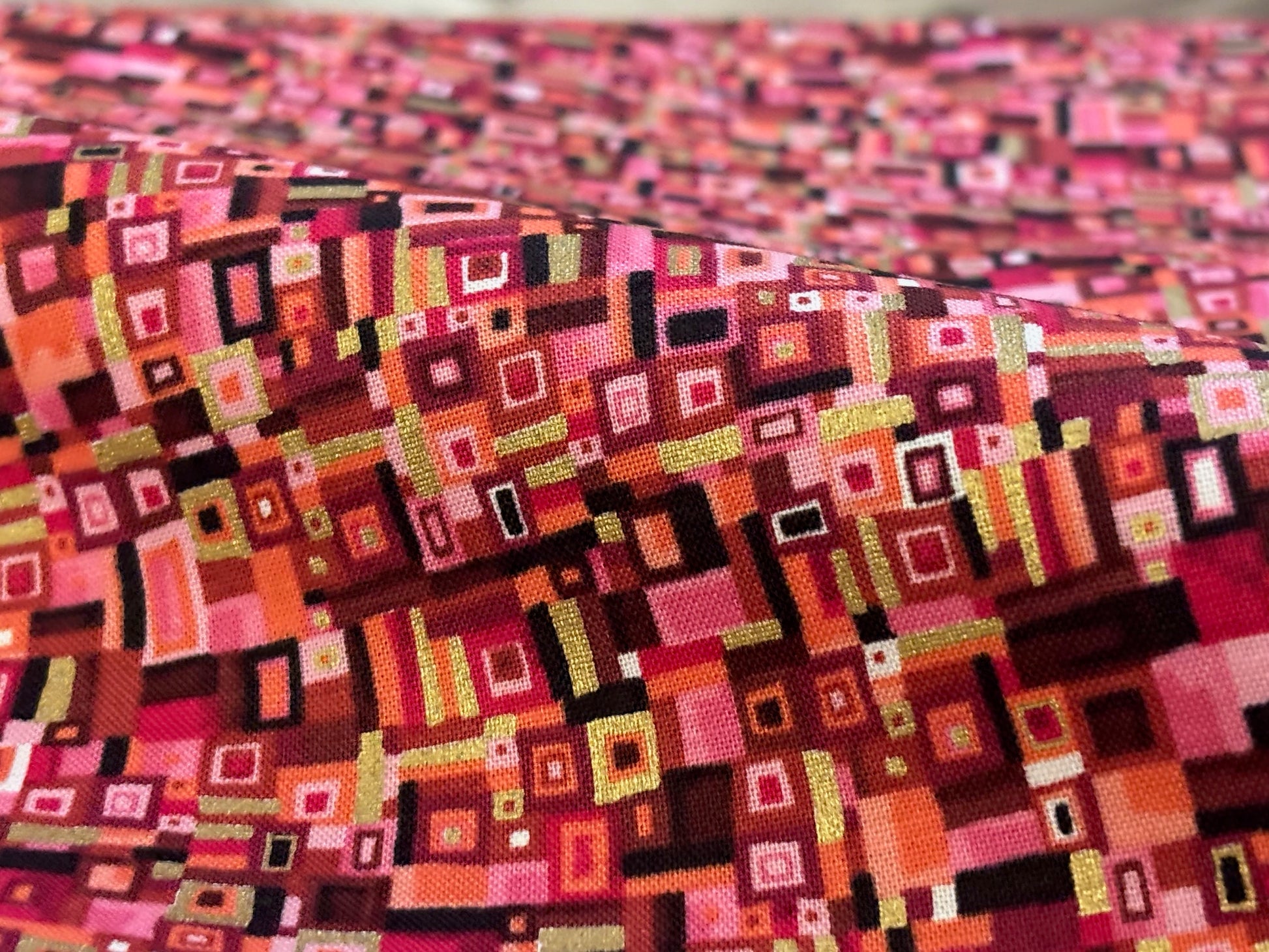 Das kommt einem bekannt vor - Muster wie ein Klimtgemälde oder Hundertwasser. In harmonischen Rot- und Rosatönen, akzentuiert mit Gold metallic Glitzer. Traumhaft schöner Stoff für zauberhafte Kreationen. Vielseitig kombinierbar. Für modische Accessoires, Heimdeko, Taschen, Kissen, Patchwork und Quilts und vieles mehr. 100% Baumwolle, Breite 110 cm.