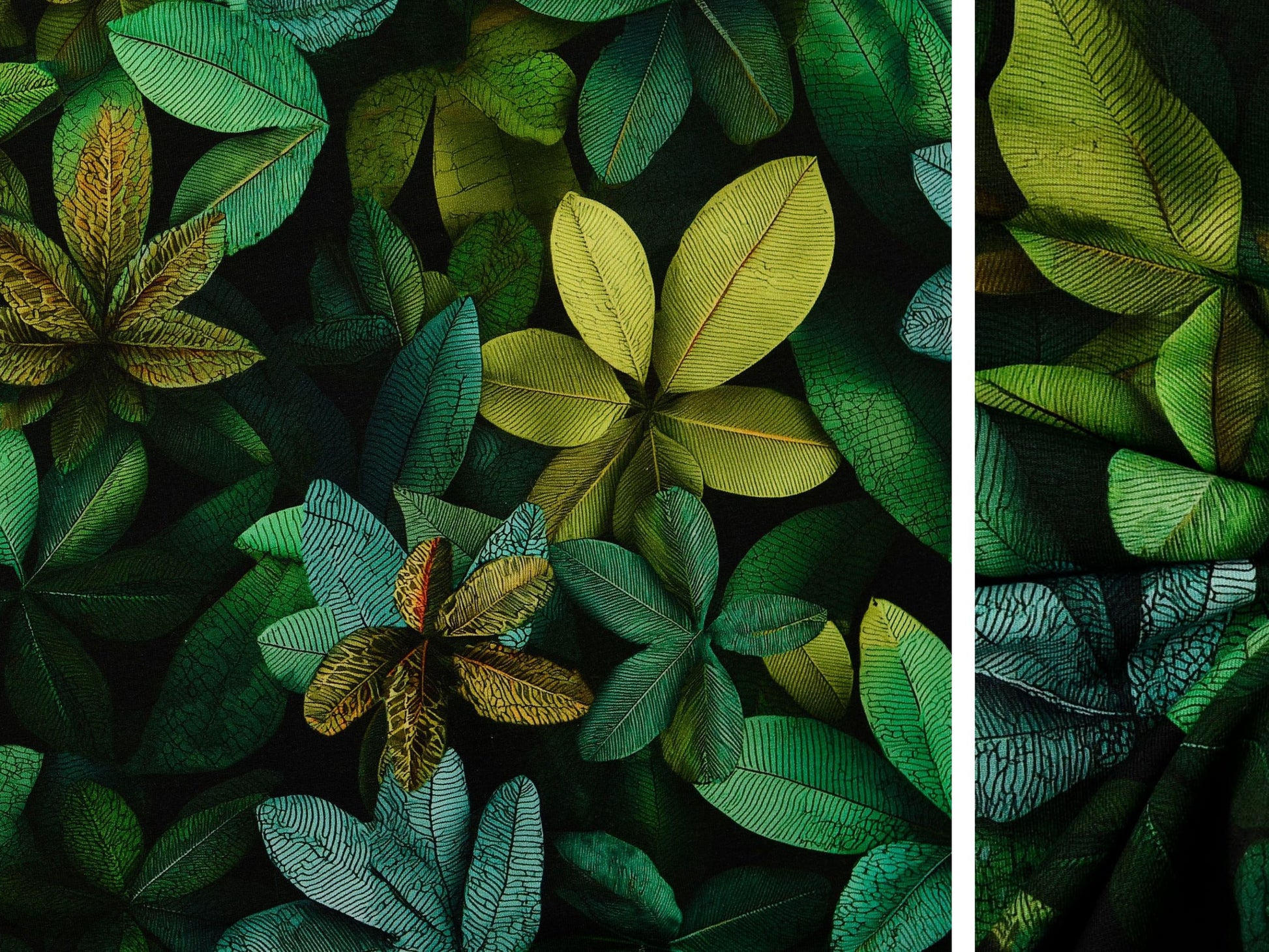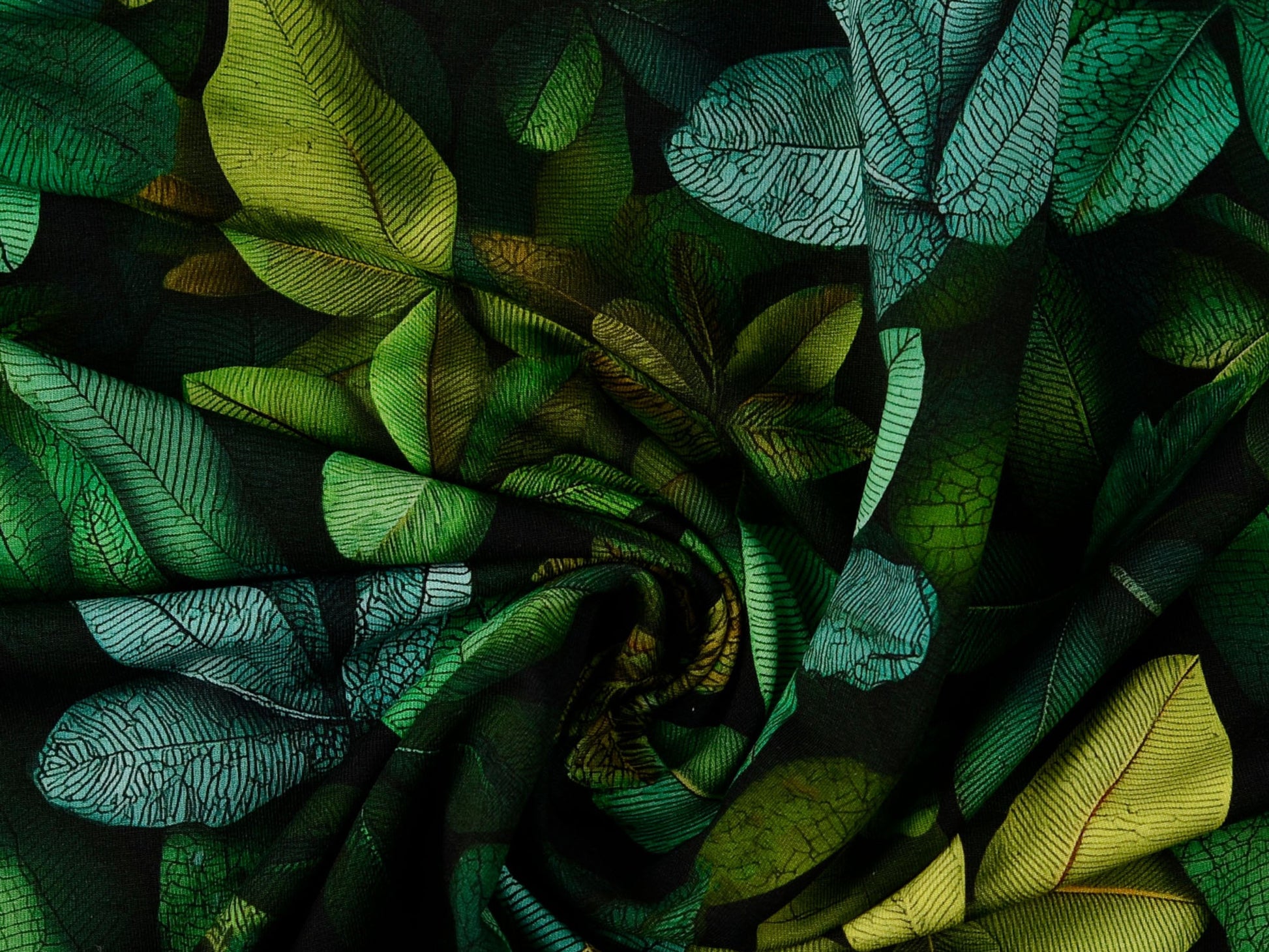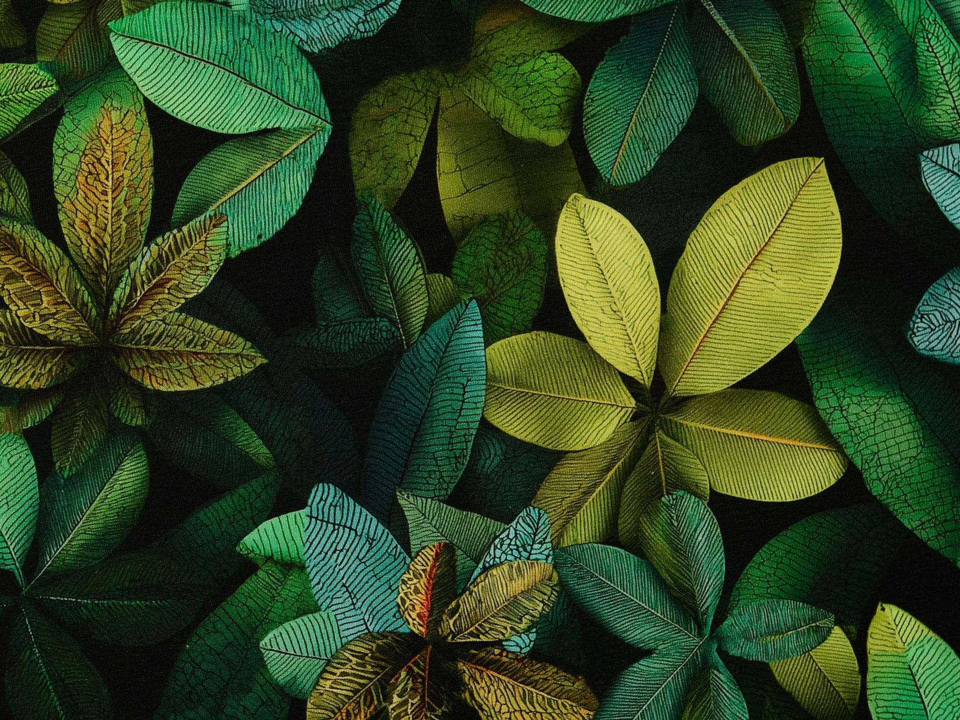 Aufregendes Design mit Blättern in intensiven, tiefen Farben - Grün in allen Schattierungen, Mint/Türkis und Lemongelb auf sehr dunklem Grün. Der Hingucker für Oberteile, Kleider, Hoodies, Jacken und vieles mehr. Digitaldruck, 95% Baumwolle, 5% Elasthan. 150 cm breit, 250 g/m².