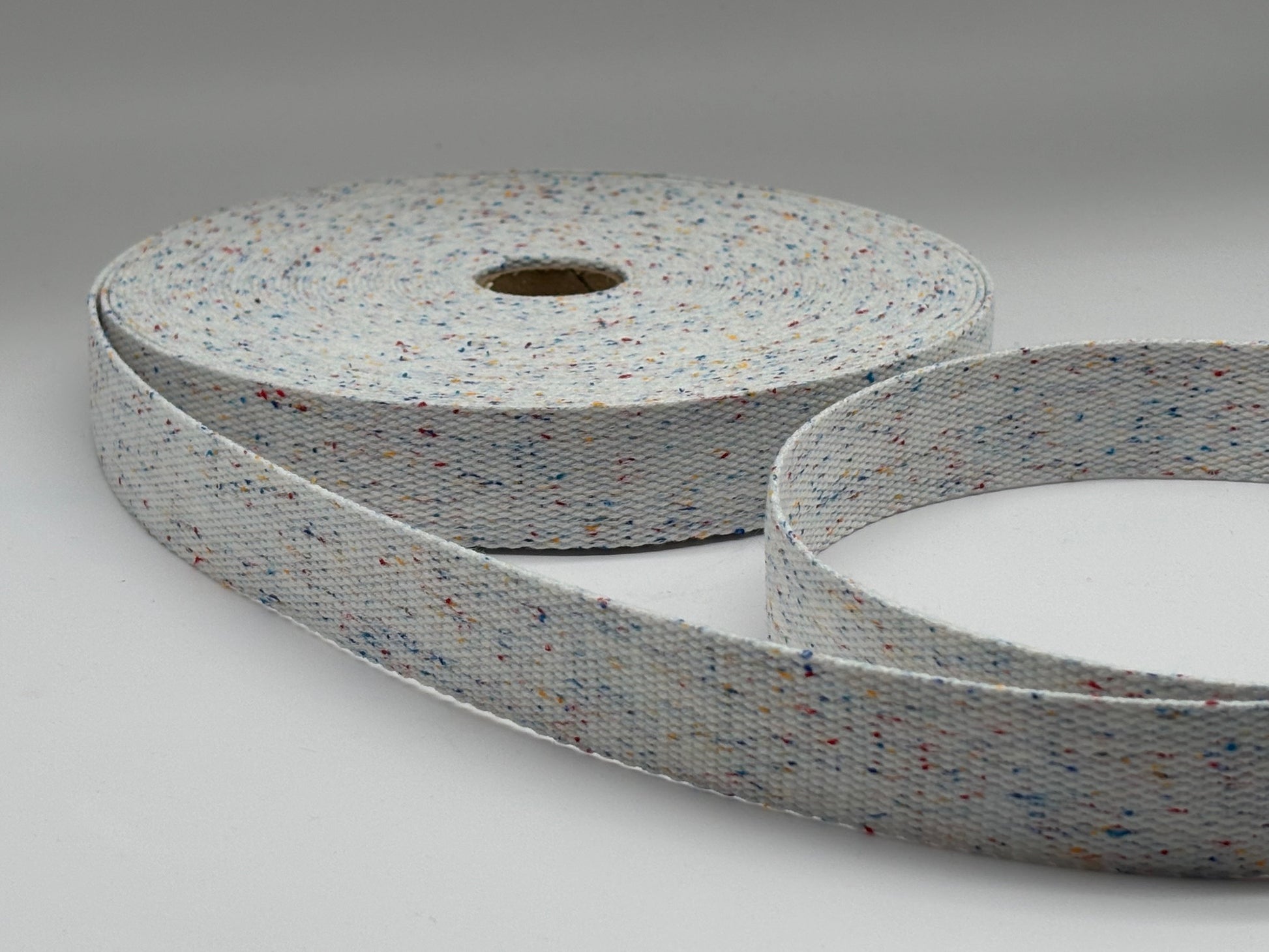 Weißes Gurtband bunt gesprenkelt. Stofflicher Look. 30 mm breit. Toller Tragegurt für Deine unverwechselbaren Taschenkreationen. 100% strapazierfähiges Polyester.