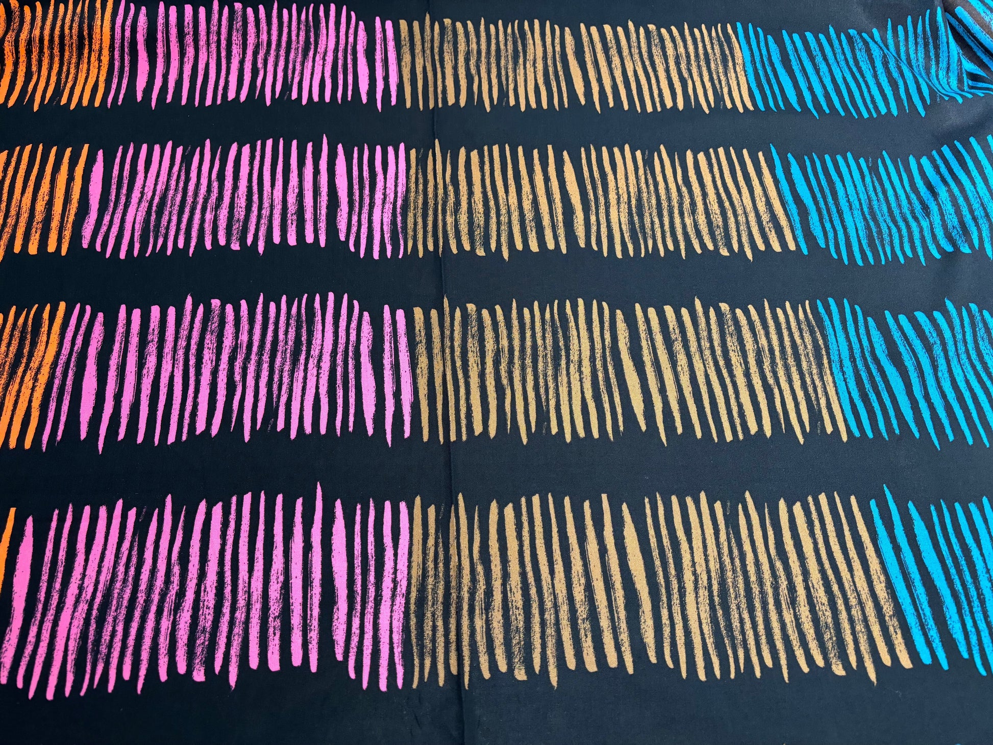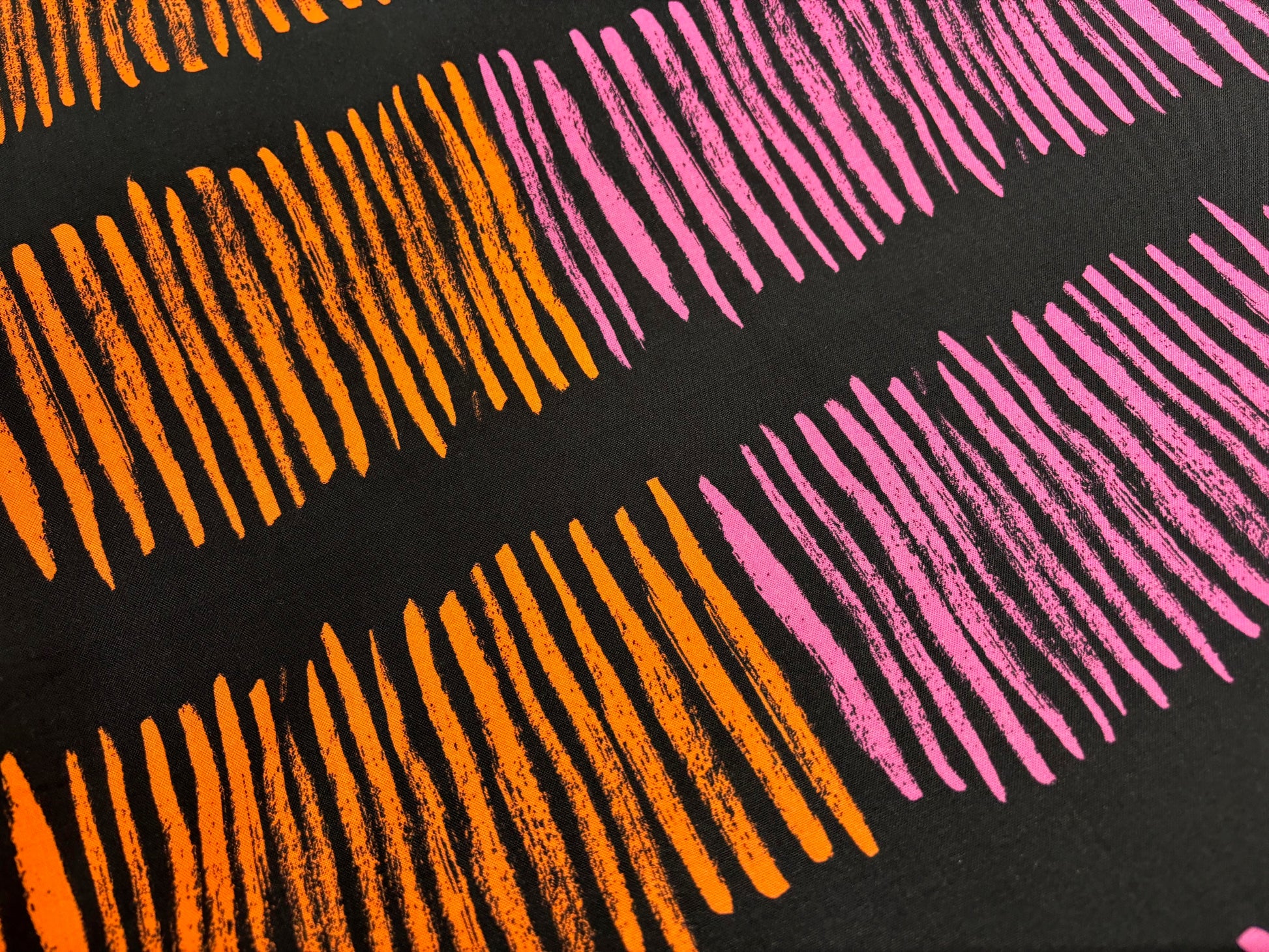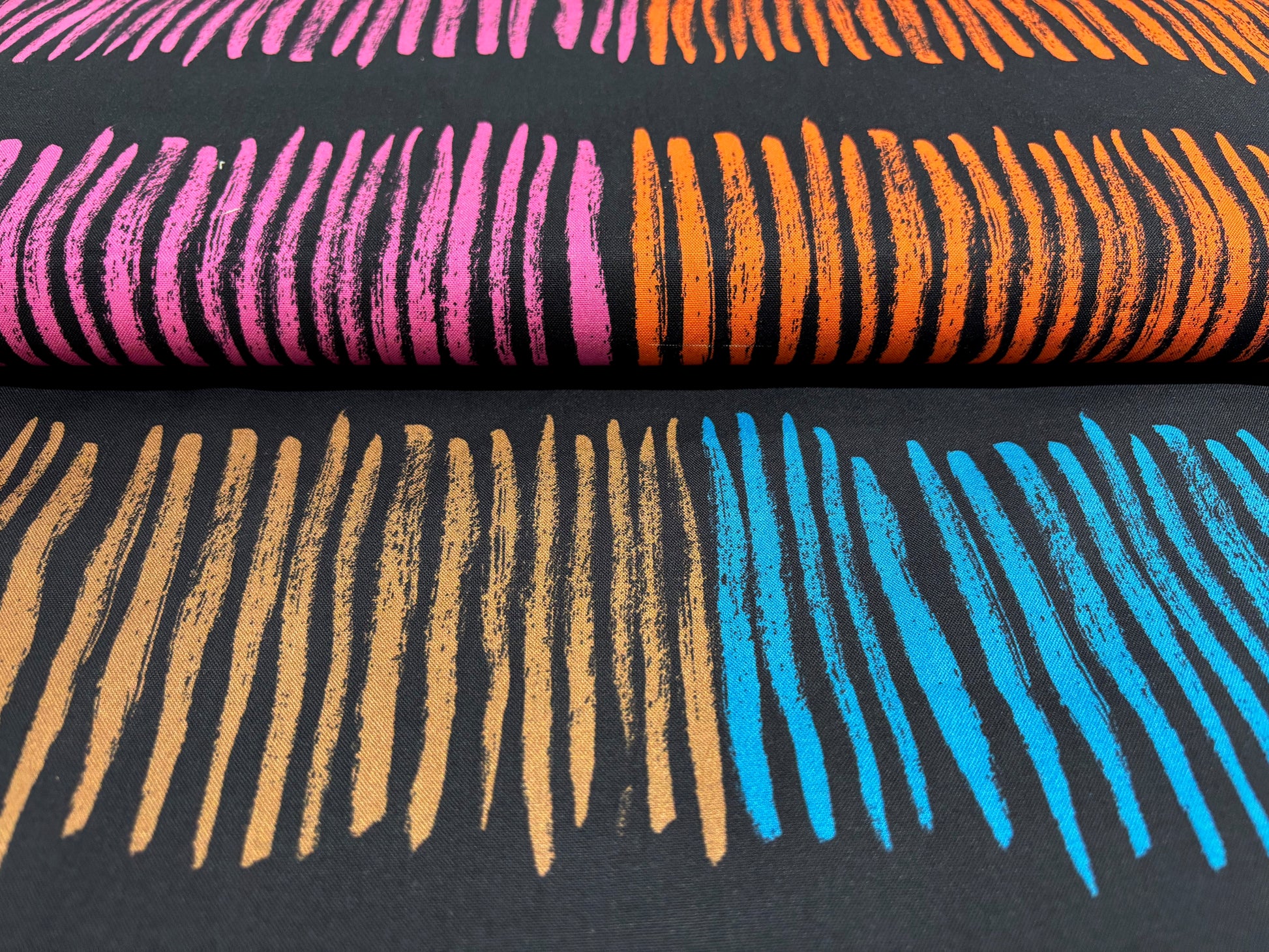 Leuchtende Pinselstriche in Pink, Orange, Türkis und Braun. Rapport (12 ch hoch) auf Schwarz. Extravagantes, grafisches Design mit dem man richtig spielen kann. Je nach Ausschnitt und Verarbeitung entsteht ein immer neuer Look. The Spirit to create! Von Free Spirit. Für außergewöhnliche Kreationen, Heimtextilien, Modeaccessoires, Patchwork- und Quiltdecken, aber auch Röcke und vieles mehr. 100% Baumwolle, 110 cm breit