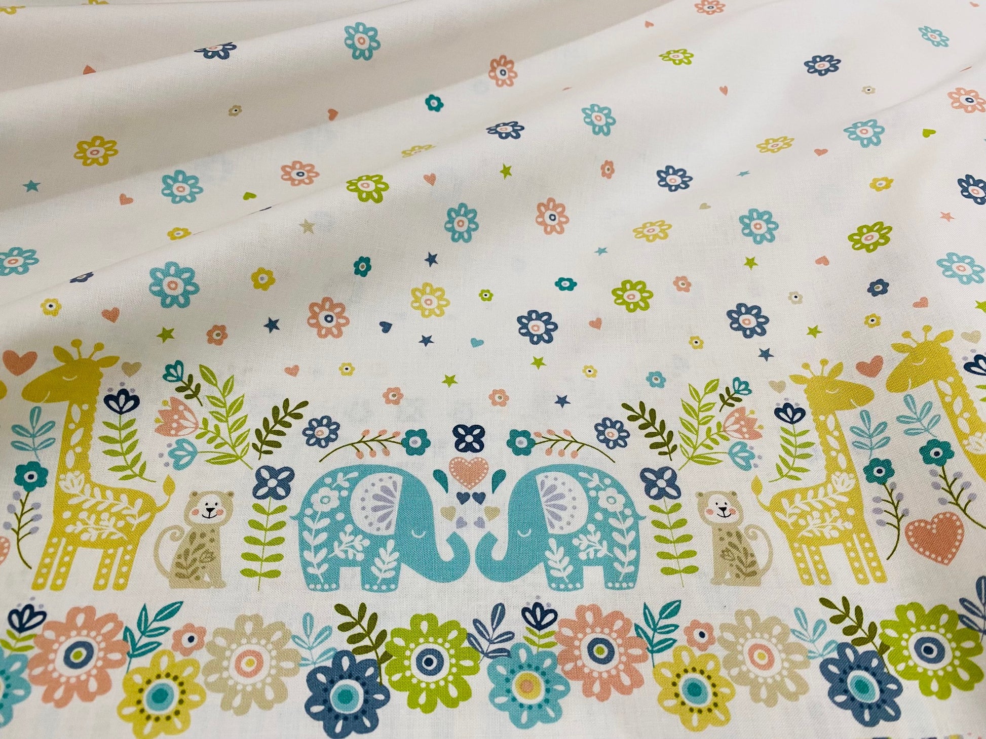 Herzallerliebst - Baumwollstoff mit Bordüre (13 cm hoch) an beiden Stoffenden. Elefanten, Giraffen und Blumen. Nach oben hin wunderschöne Blüten, kleine Sternchen und Herzchen - alles in pastelligen Farben auf naturweißem Untergrund. 100% Baumwolle, 110 cm breit. Schön auch als Vorhang, Nestchen, Babydecke, Kinderkleidchen und mehr.