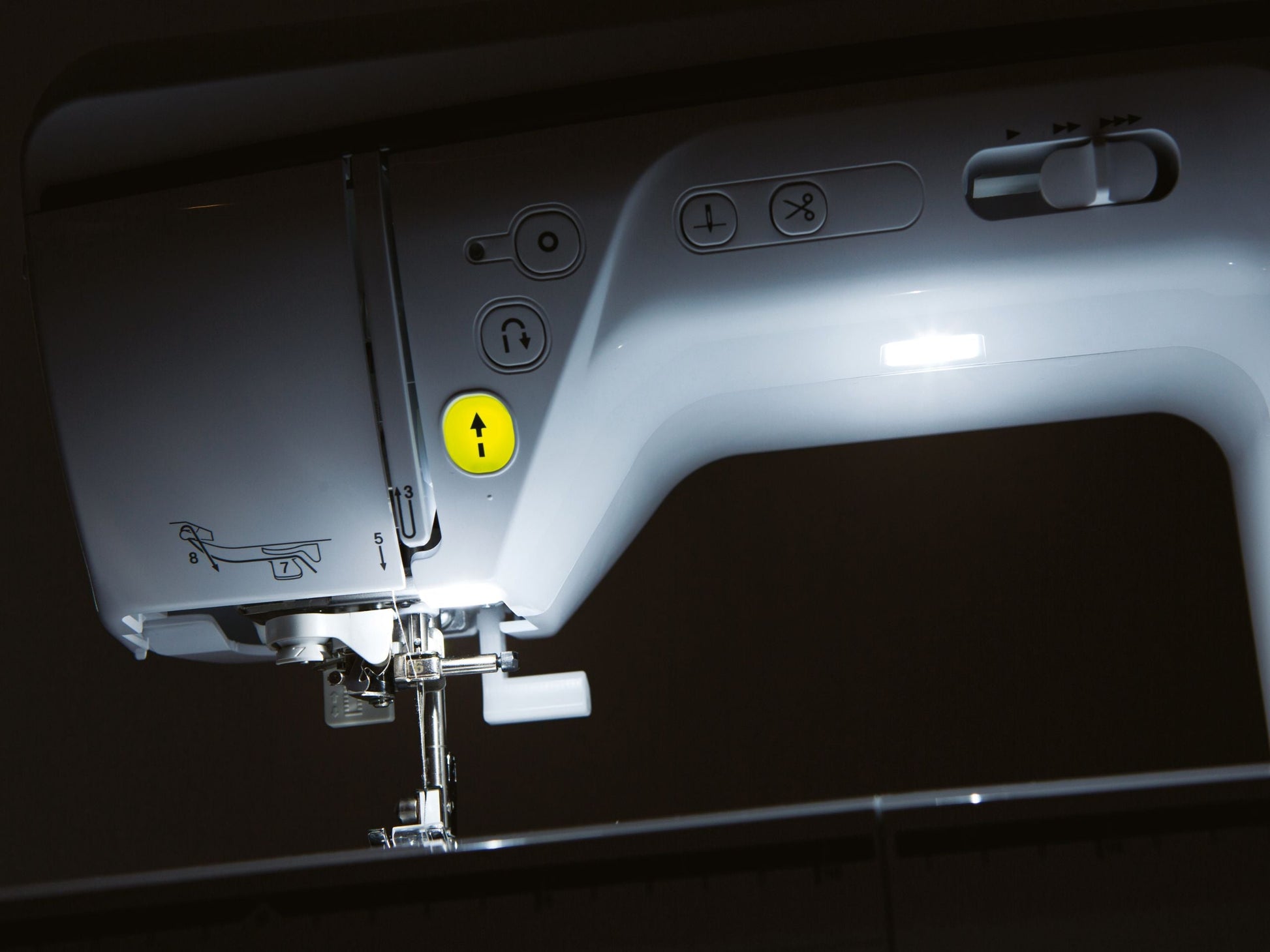 Schnell oder langsam nähen, mit Schieber zum Regeln der Nähgeschwindigkeit. Wichtig auch wenn Kinder an der Nähmaschine arbeiten.