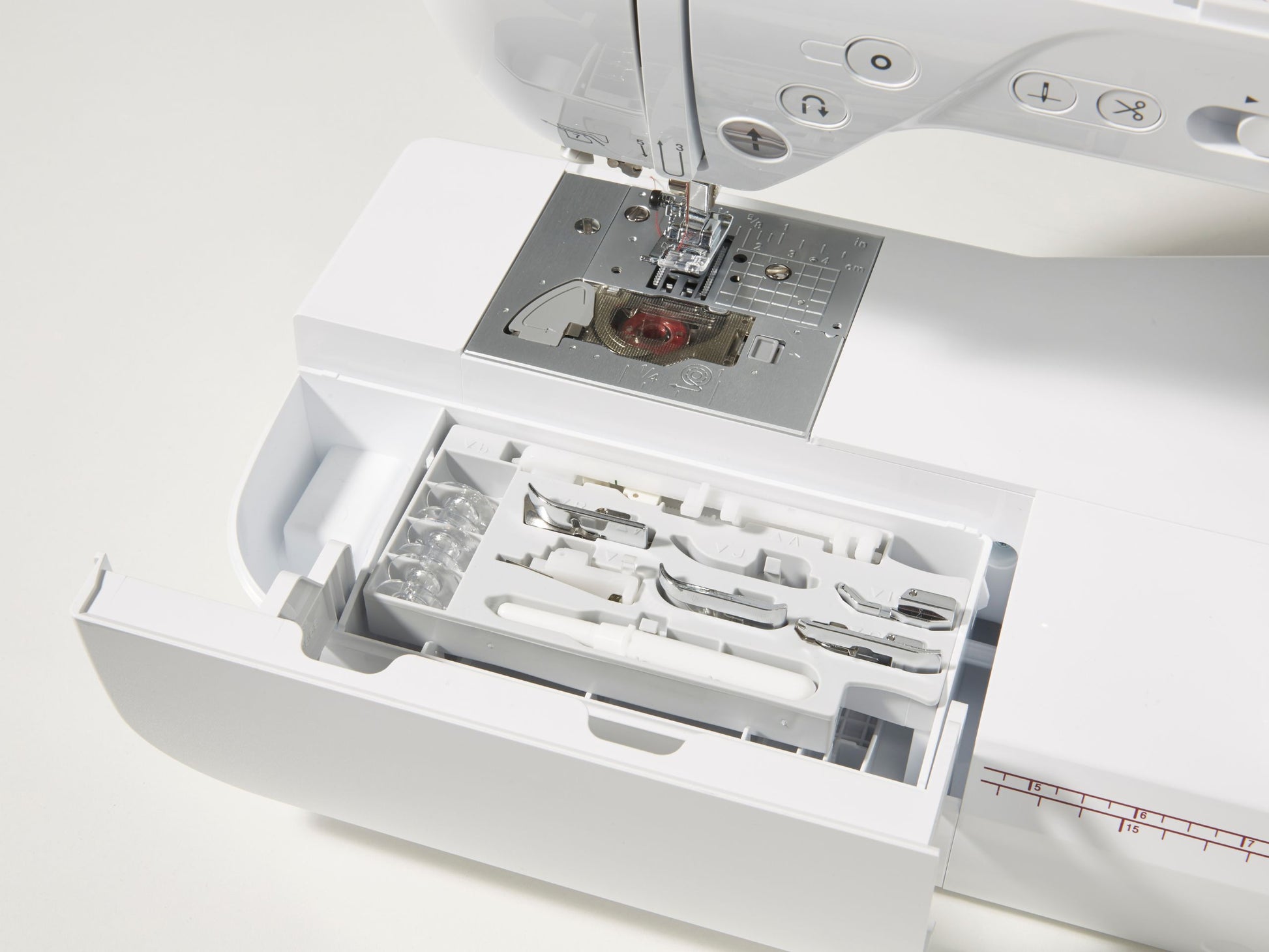 • Mit 7 Nähfüßen und vielfältigem Zubehör.
