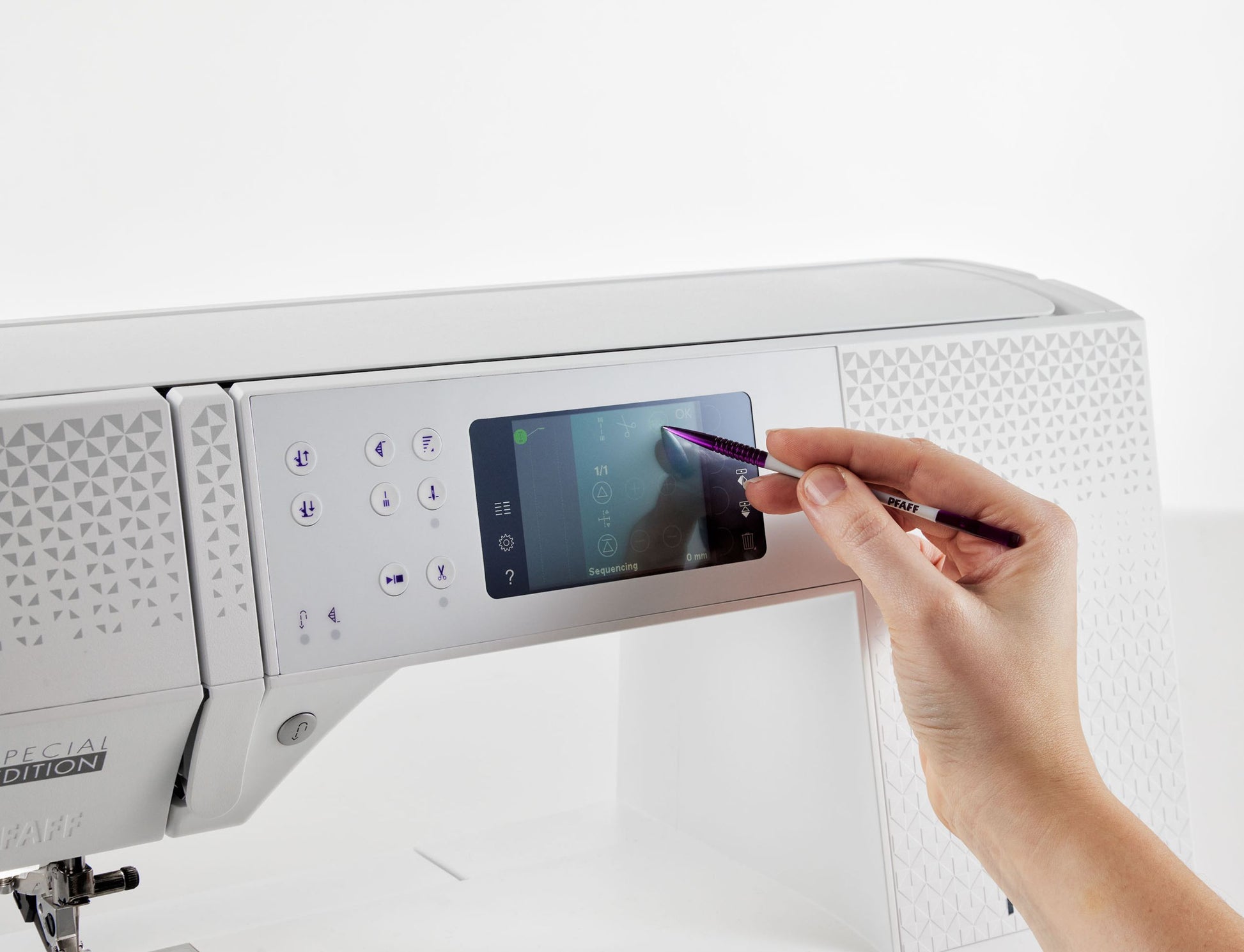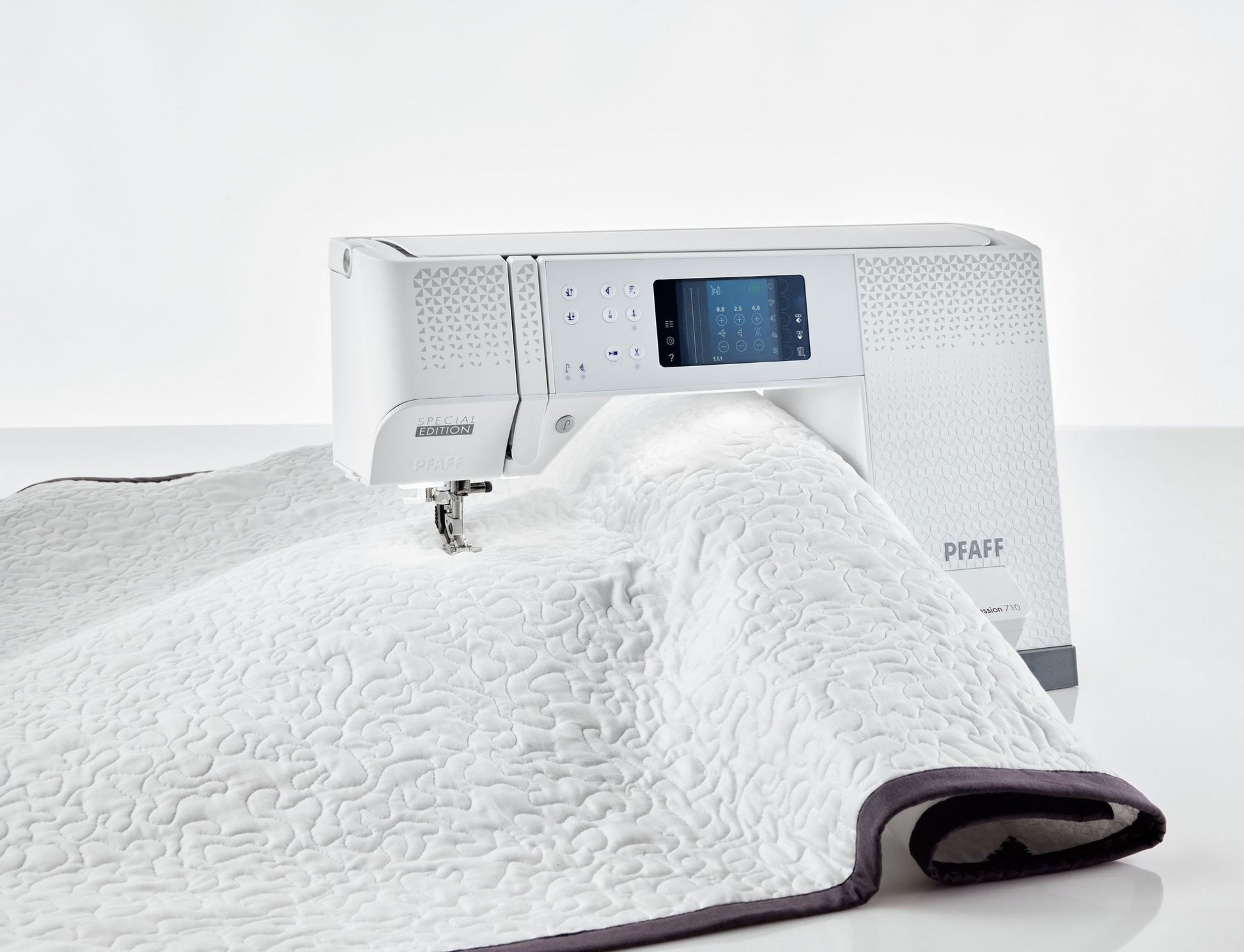Sondermodell PFAFF expression 710 special edition - 5 Sonder-Nähfüße (i.W.v. über € 100,-) geschenkt! Edles weißes Design. Traum-Nähmaschine mit gehobenem Komfort und hochauflösendem Color-Touch-Screen. Vollautomatische Fadenspannung, Ober- und Unterfadenabschneider, automatischer Nähfußhub und extra starker Motor. Mit Pfaff IDT-System, absolut gleichmäßiger Storfftransport von oben und unten. Über 247 Stiche, Jersey perfekt verarbeiten, professionelle Knopflöcher, Unterfadenwächter, extra viel Platz, große Stoffmengen bequem verarbeiten. Updateable! Innerhalb Deutschland versandkostenfrei.