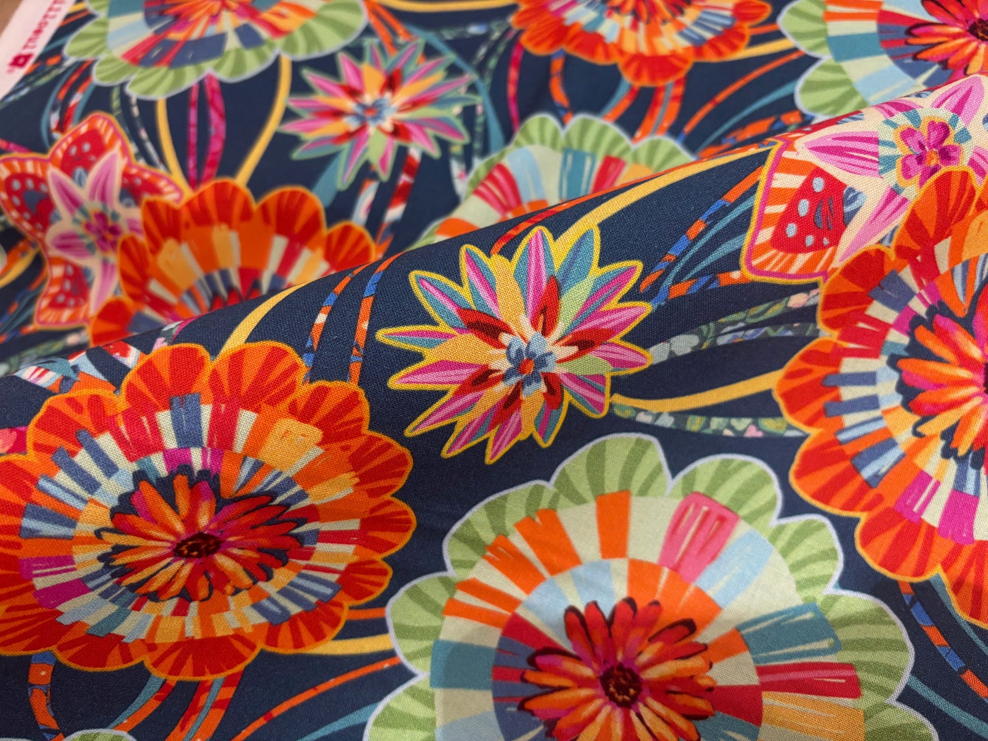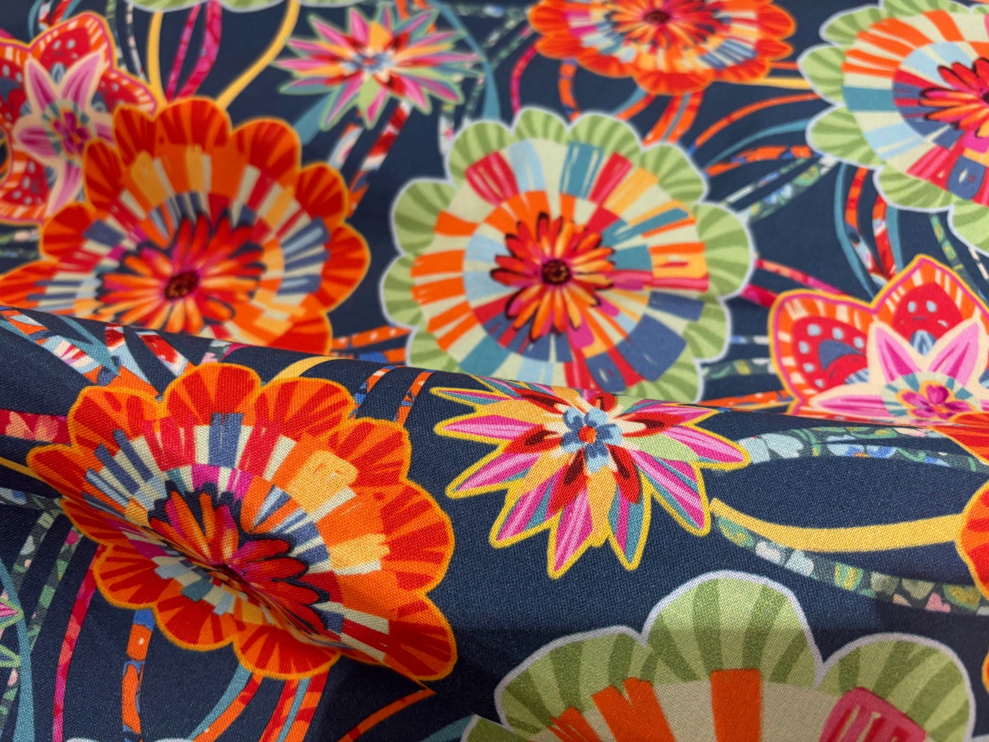 Stoff von Odile Bailloeul. Das Festival der Farben. Flowers all over. In leuchtendem Rot, Grün, Türkis auf Petrolblau.  Atemberaubend schön und sehr besonders.  Ein Design für außergewöhnliche Kreationen im Landhausstil. Für Heimtextilien, Patchwork- und Quiltdecken und mehr. Free Spirit. 100% Baumwolle, 110 cm breit