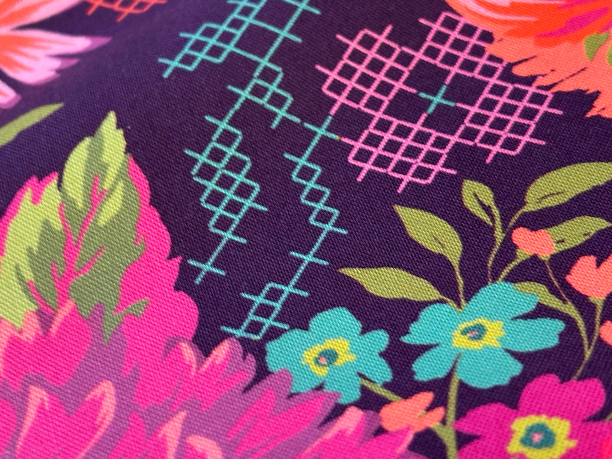 Atemberaubendes Blumendesign in starken Farben. Man kann sich gar nicht satt sehen. Intensiv leuchtendes Pink, Rosa, Lila, Türkis auf tiefem Violett. Mit witzigen Kreuzstichmustern. Ein Traumstoff. In the Parlor, hospitality Blooms von MODA. Breite 110 cm, 100% Baumwolle.