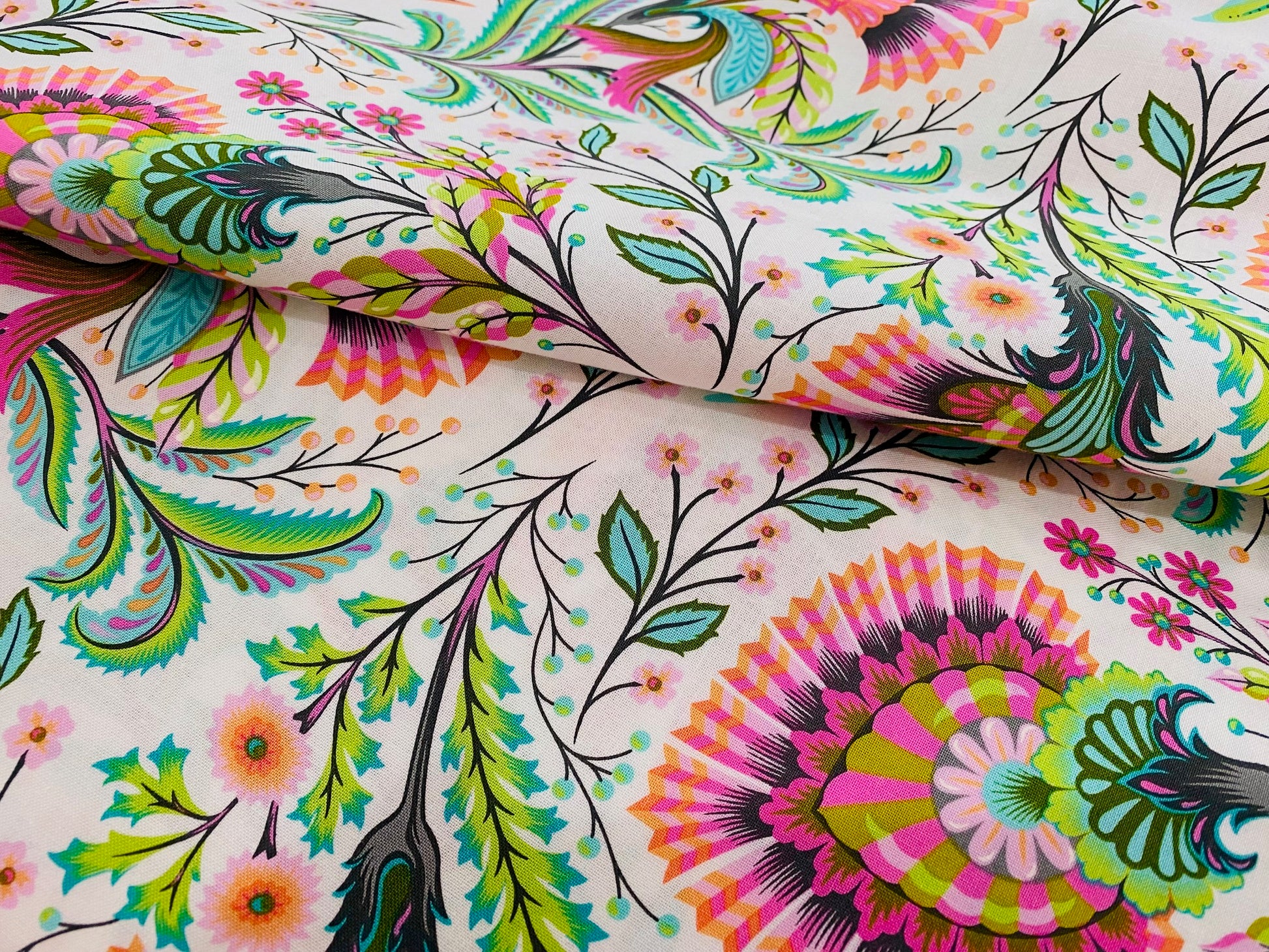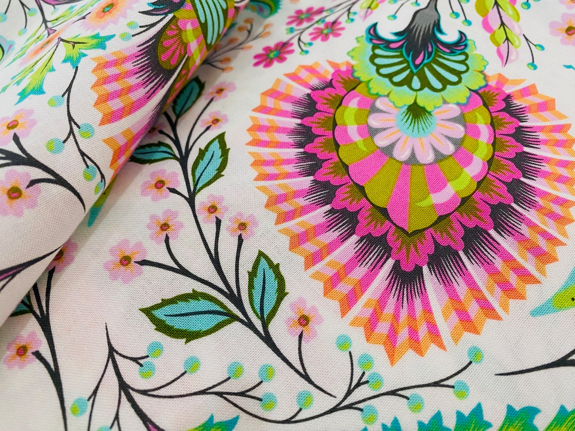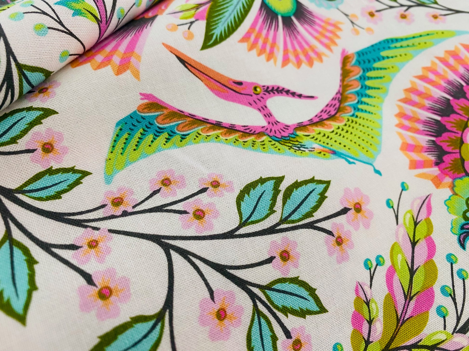Florale Landschaften - Einfach mal eintauchen. Und was entdeckt man da? Den Flugsaurier Quetzalcoatlus! Gut getarnt in der Welt von Tula Pink. Alles in unverwechselbaren, leuchtenden Farben, Pink, Rosa, Grün und Türkis. Unverkennbar Tula Pink, aus der Serie Roar! Ein Design für außergewöhnliche Kreationen, Heimtextilien, Modeaccessoires, Patchwork- und Quiltdecken, aber auch Bekeidung. Free Spirit. 100% Baumwolle, 110 cm breit