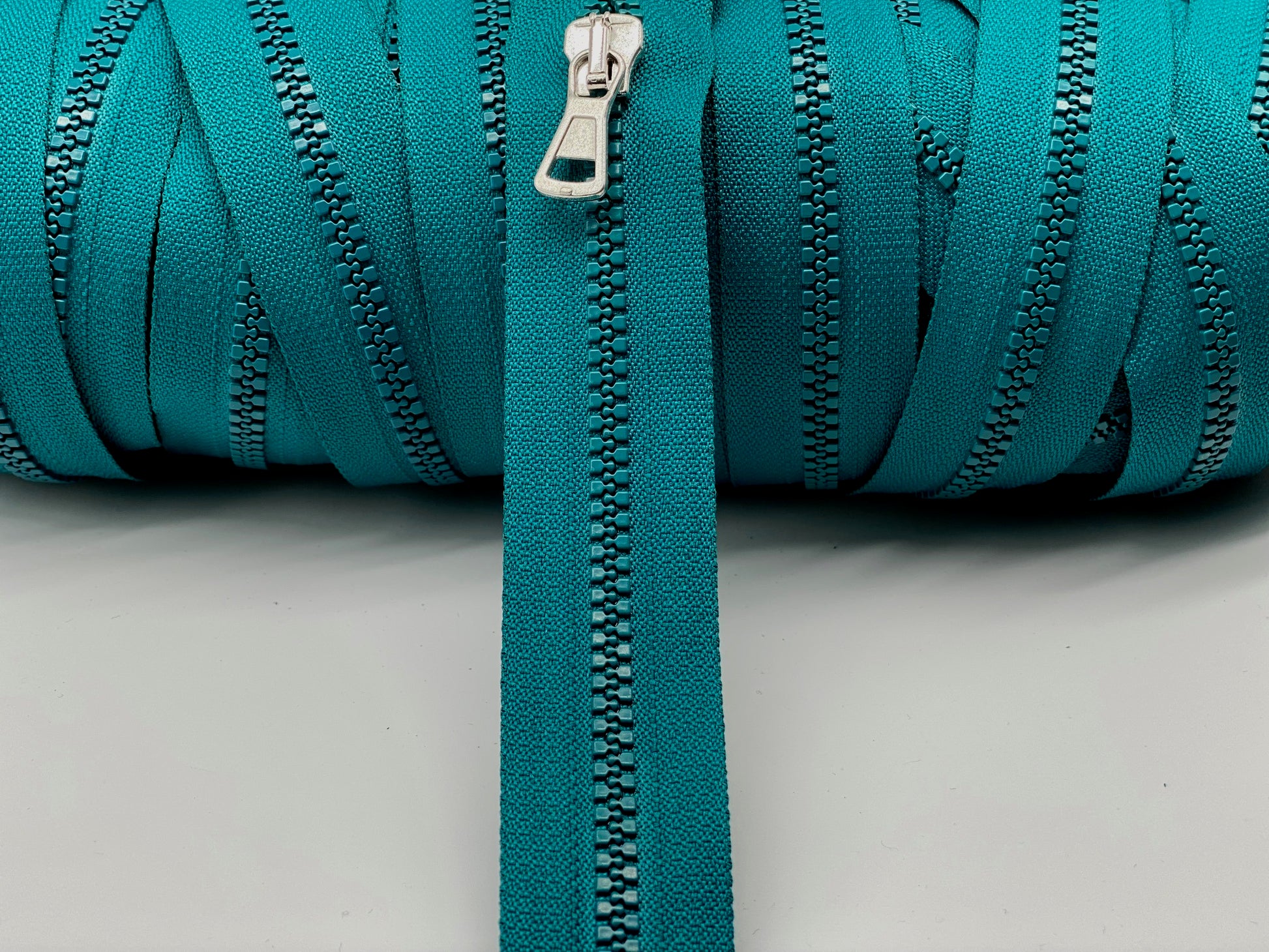 Petrolgrüner, dekorativer Reißverschluss mit robuster Kunststoffraupe 5,8 mm breit. Gesamtbreite 30 mm. Für Taschen, Heimtextilien, Kindersachen, Schlafsack u. v. m. Achtung: nicht teilbar, nicht für Jacken geeignet. Meterware ohne Zipper, in Deiner Wunschlänge bestellen. NICHT VERGESSEN: Zipper in gewünschter Anzahl dazubestellen. Wird aufgezogen geliefert.