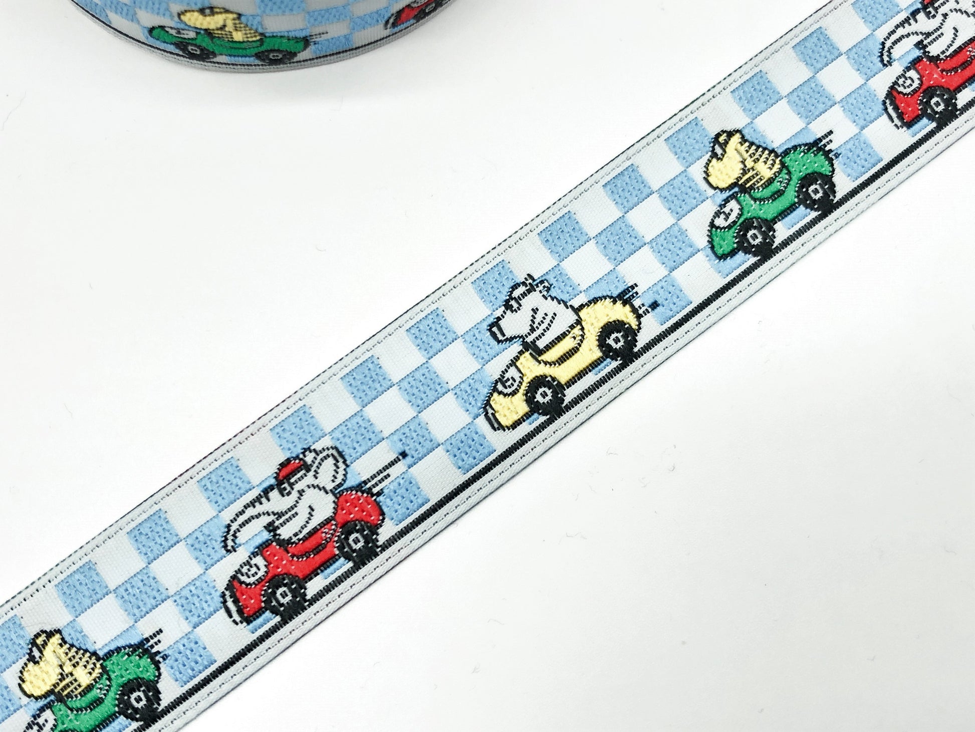 17 mm breites Webband mit autofahrenden Elefanten auf hellblau- und weißkariertem Untergrund. Ideal zur Verzierung von Kinderkleidung und Accessoires. 100% Polyester