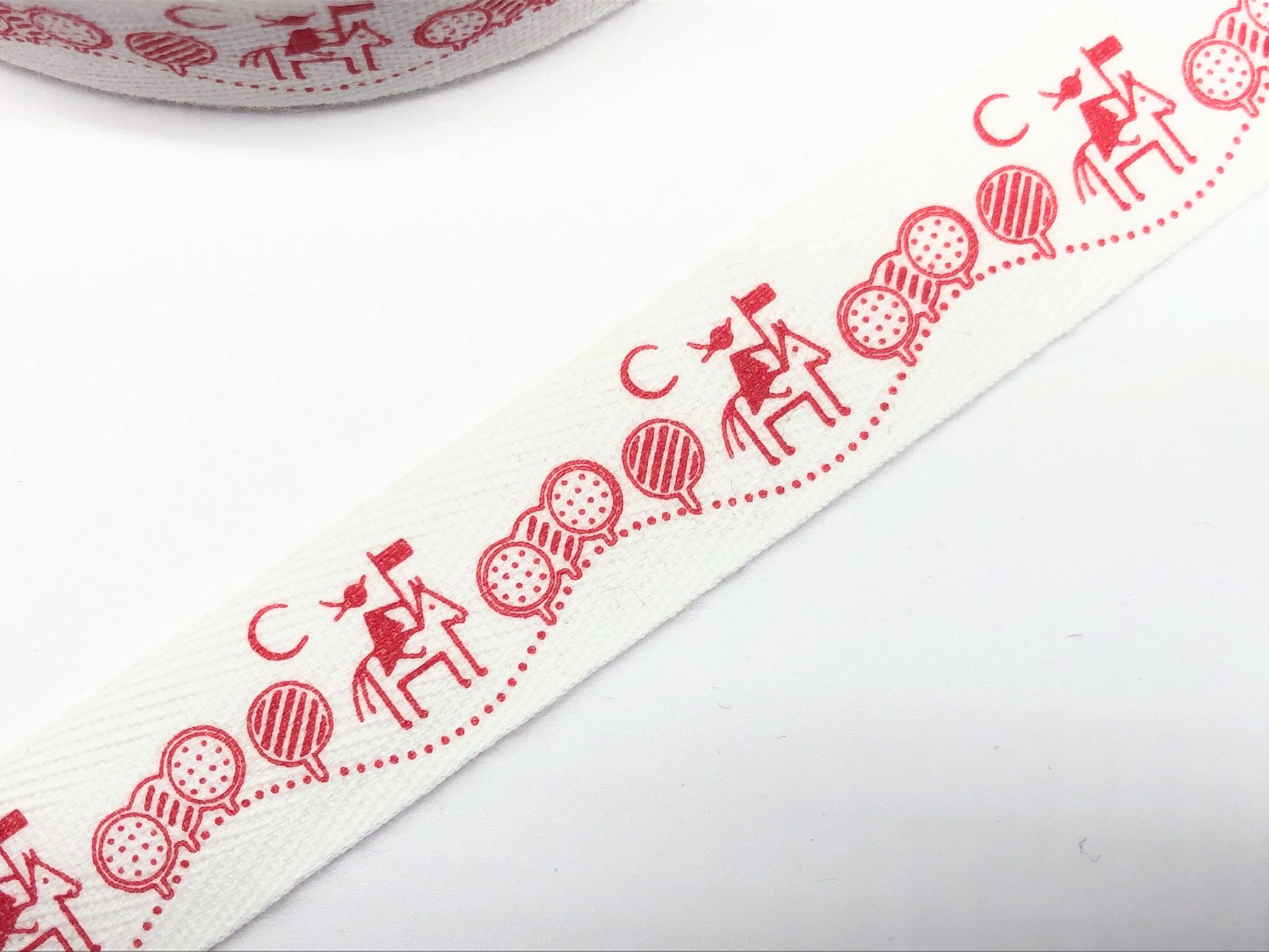 20 mm breites Weißes Webband mit rotem Aufdruck. Das Motiv, ein Reiter umgeben von Bäumen, ist ca. 1,5 cm groß. Geeignet zum Verzieren von Kleidung, Taschen und Accessoires.