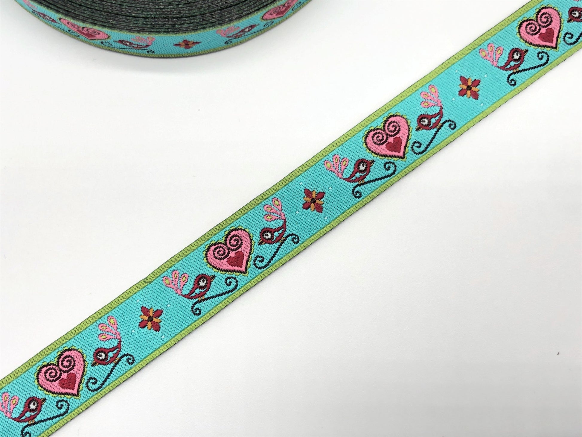 Webband Vögelchen & Herz Türkis