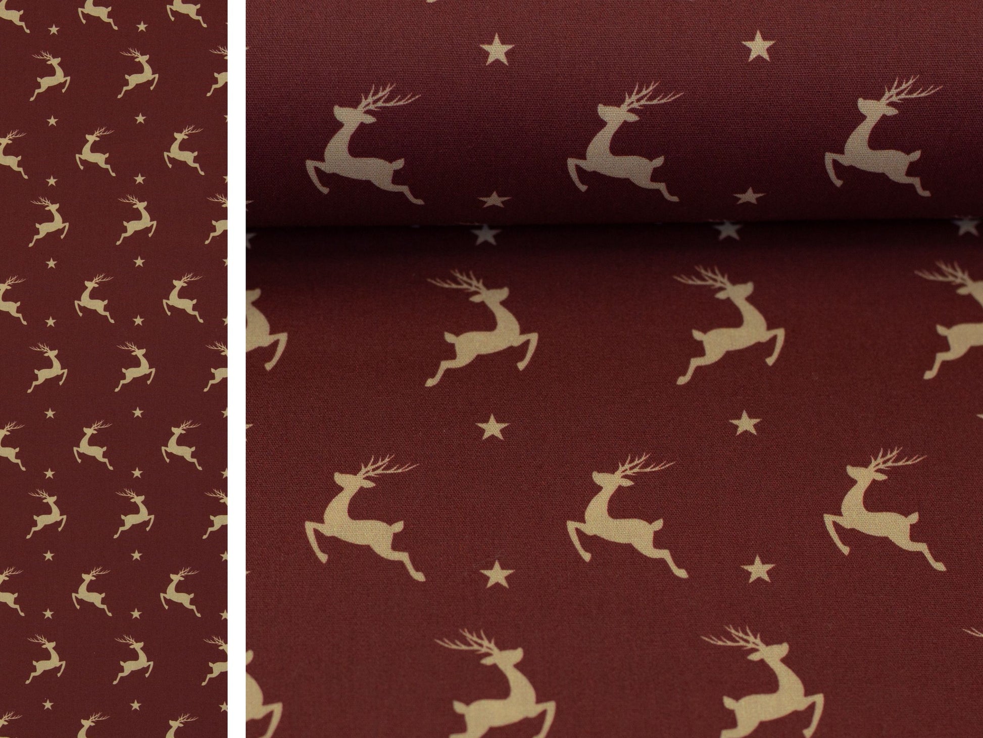 Kleine Rentiere (ca. 2 x 2 cm) mit Sternchen, in weihnachtlichem Rotbraun/Bordeaux. Für festliche Ideen aus Stoff. 147 cm breit, 130 g/m², 100% Baumwolle.