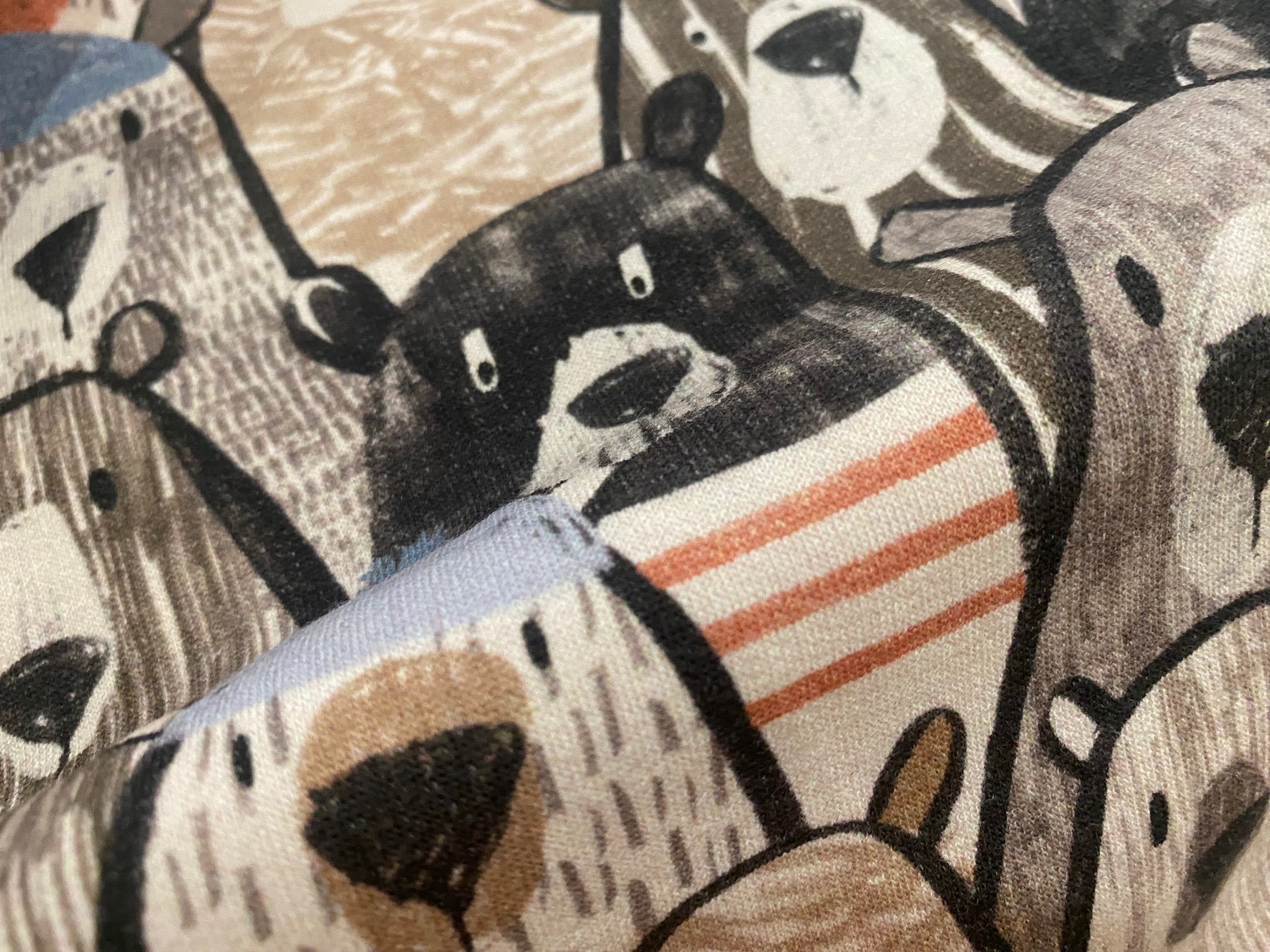 Eine ganze Horde lustiger Bären (6 cm hoch) mit unterschiedlichem Fell und Mützen tummeln sich auf diesem French Terry. Schauen sie ein Eishockeyspiel? Man weiß es nicht. Witzig illustriert in Brauntönen, akzentuiert mit Graublau und Orange. 100 % Baumwolle , 150 cm breit, 230 g/m².