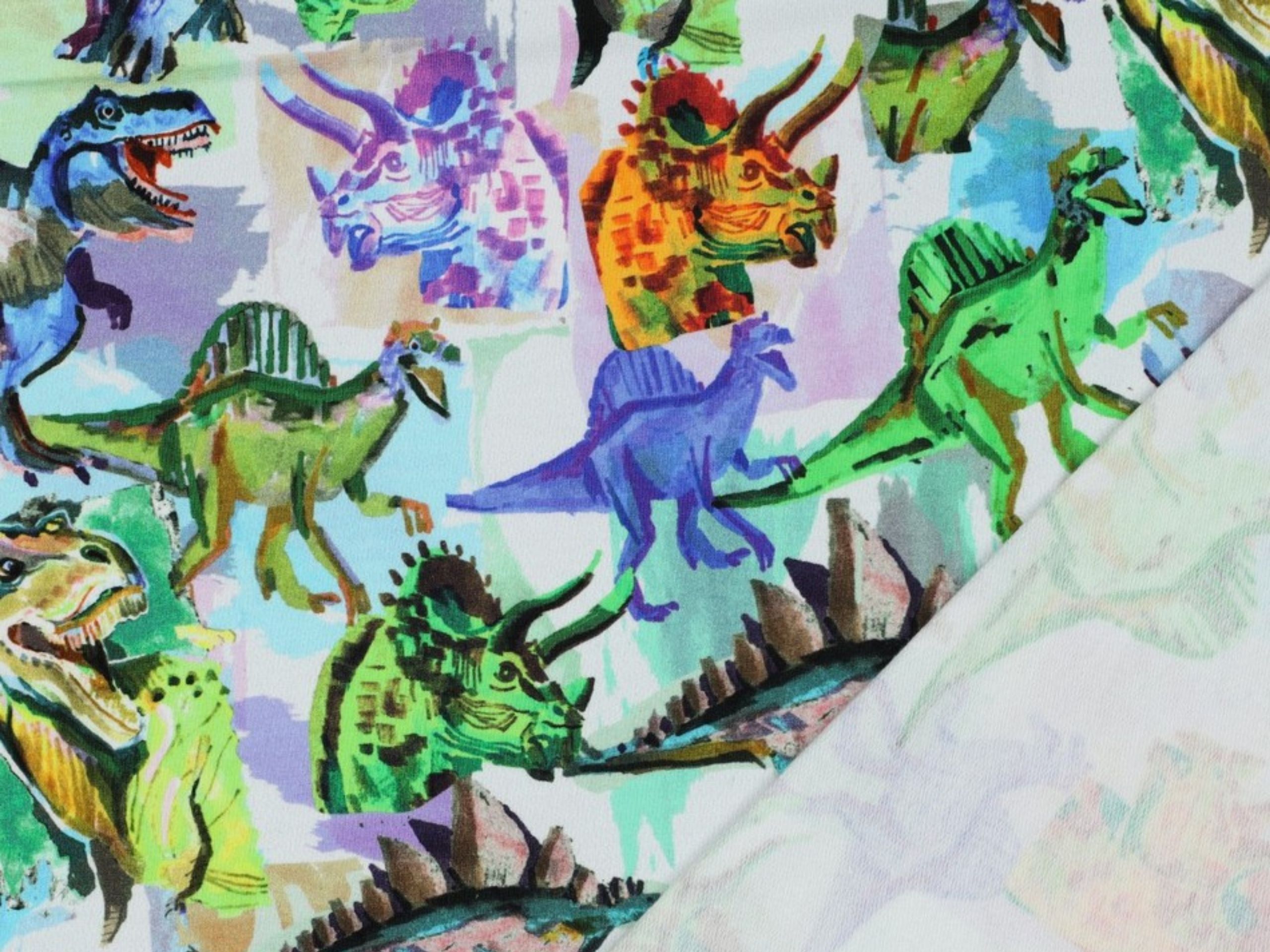 Hier ist ganz schön was los - illustrierte Dinos in knalligen Farben. Cooles Digitaldruckmotiv, French Terry/dünner Sweat mit kuscheliger Innenseite. 95% Baumwolle, 5% Elasthan. 140 cm breit, 225 g/m².