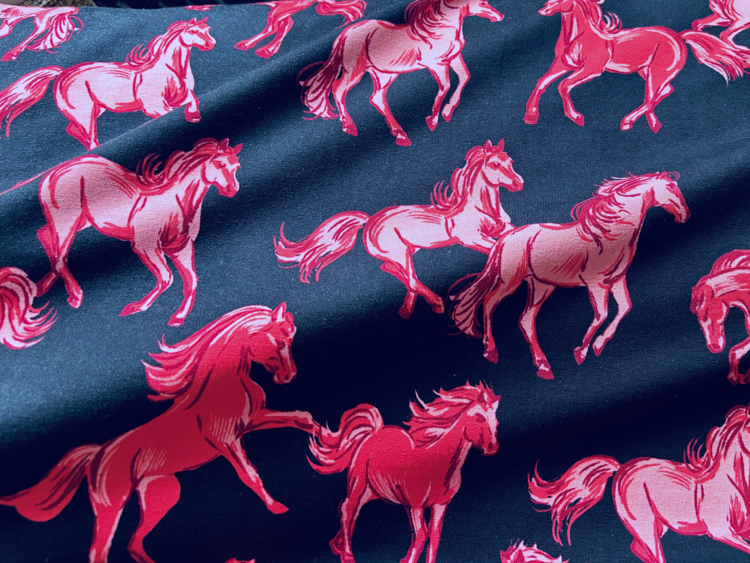 Toller French Terry mit ultimativem Pferdemotiv. Illustrierte Pferde (ca. 11 x 10 cm groß) in leuchtendem Pink und Rosa auf Dunkelblau. Ein Traumstoff für Pferdefans. Innen aufgerauht, 95% Baumwolle, 5% Elasthan, 148 cm breit.
