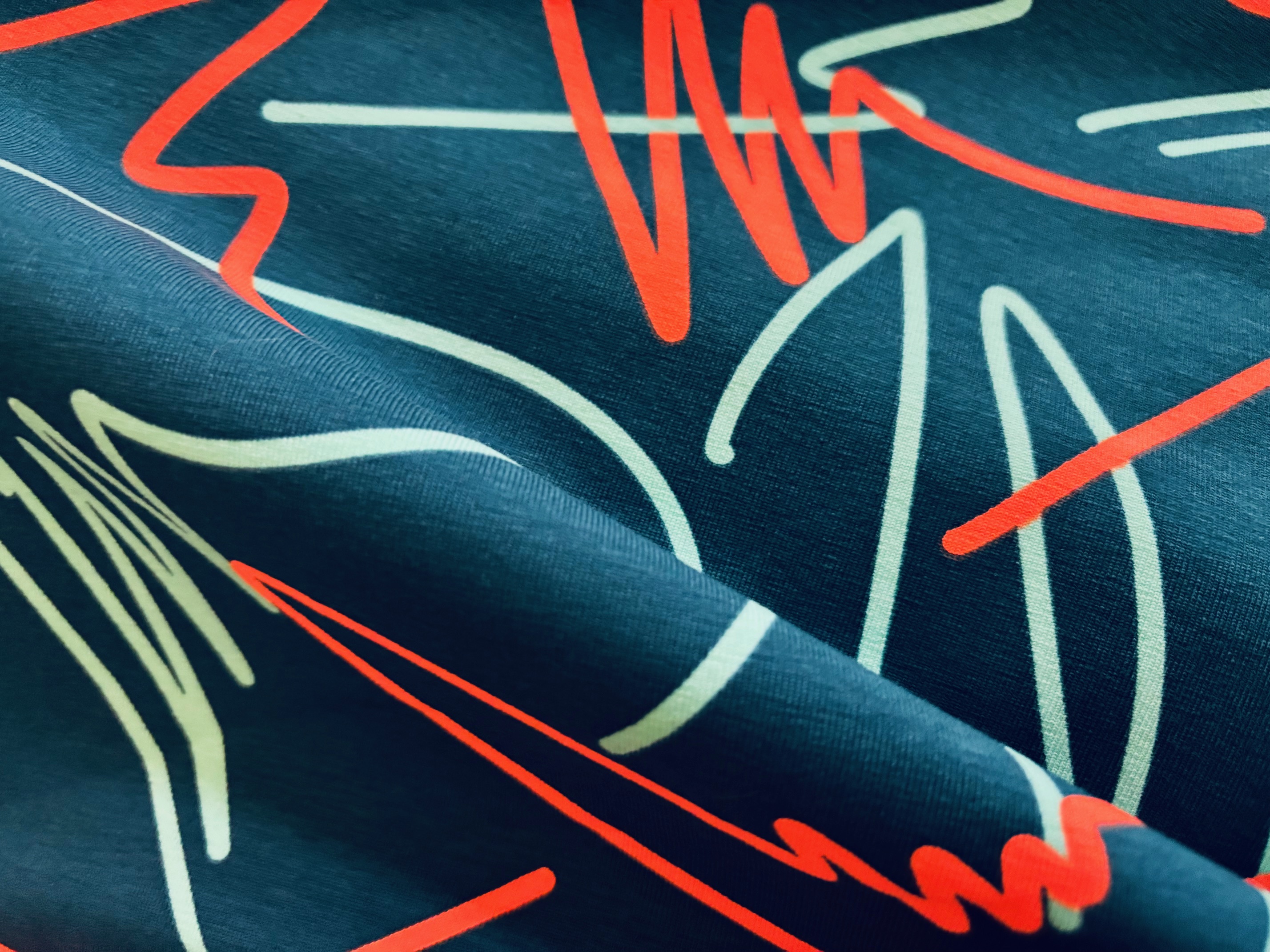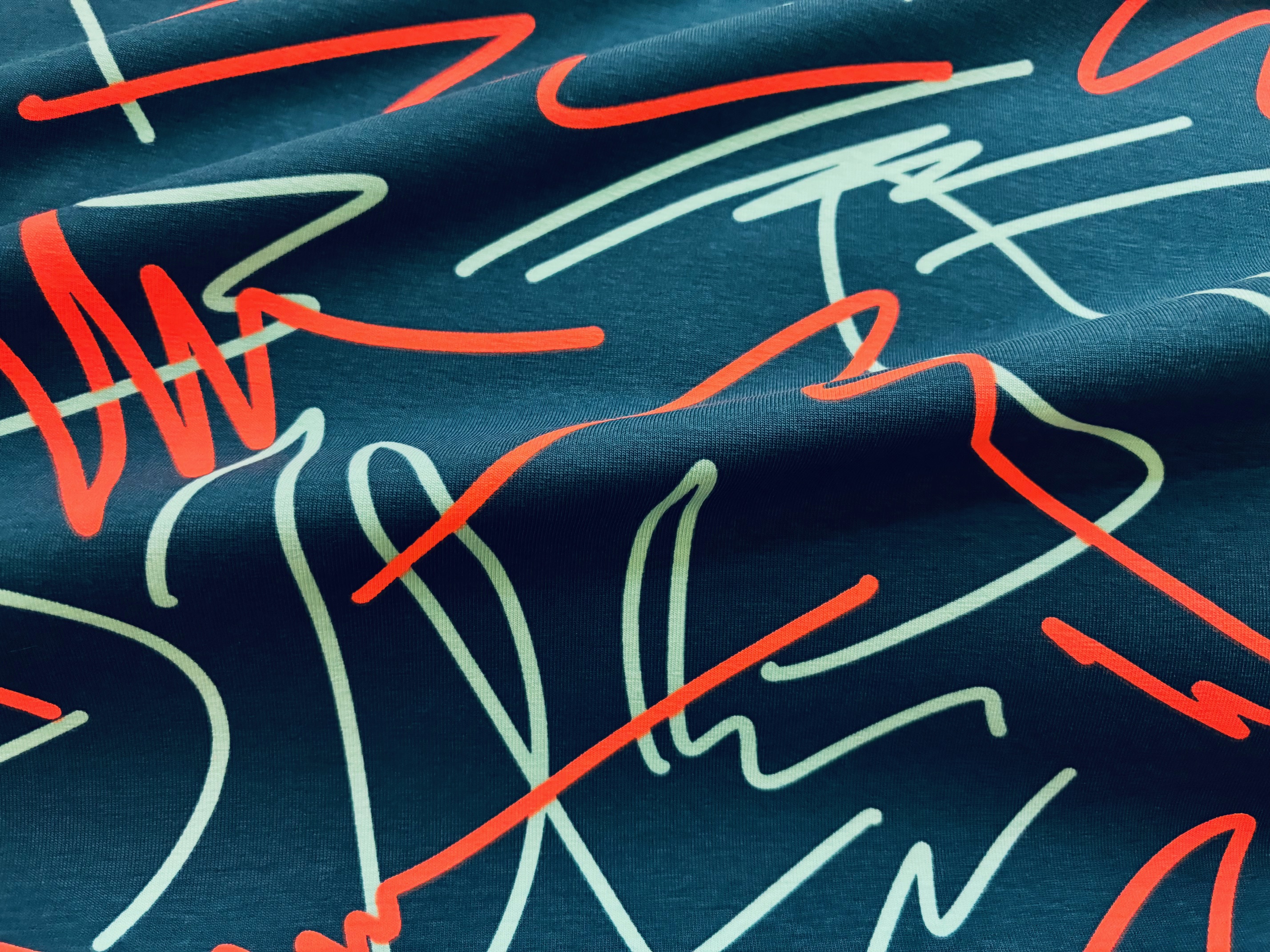 Jersey mit coolem Neoneffekt. Abstraktes Linienmuster in Weiß, Mint und frechem Neon Orange auf dunklem Petrolgrün. 95 % Baumwolle, 5 % Elasthan, 148 cm breit. Gleich im smilla Jerseykurs anmelden und was Schönes zaubern!