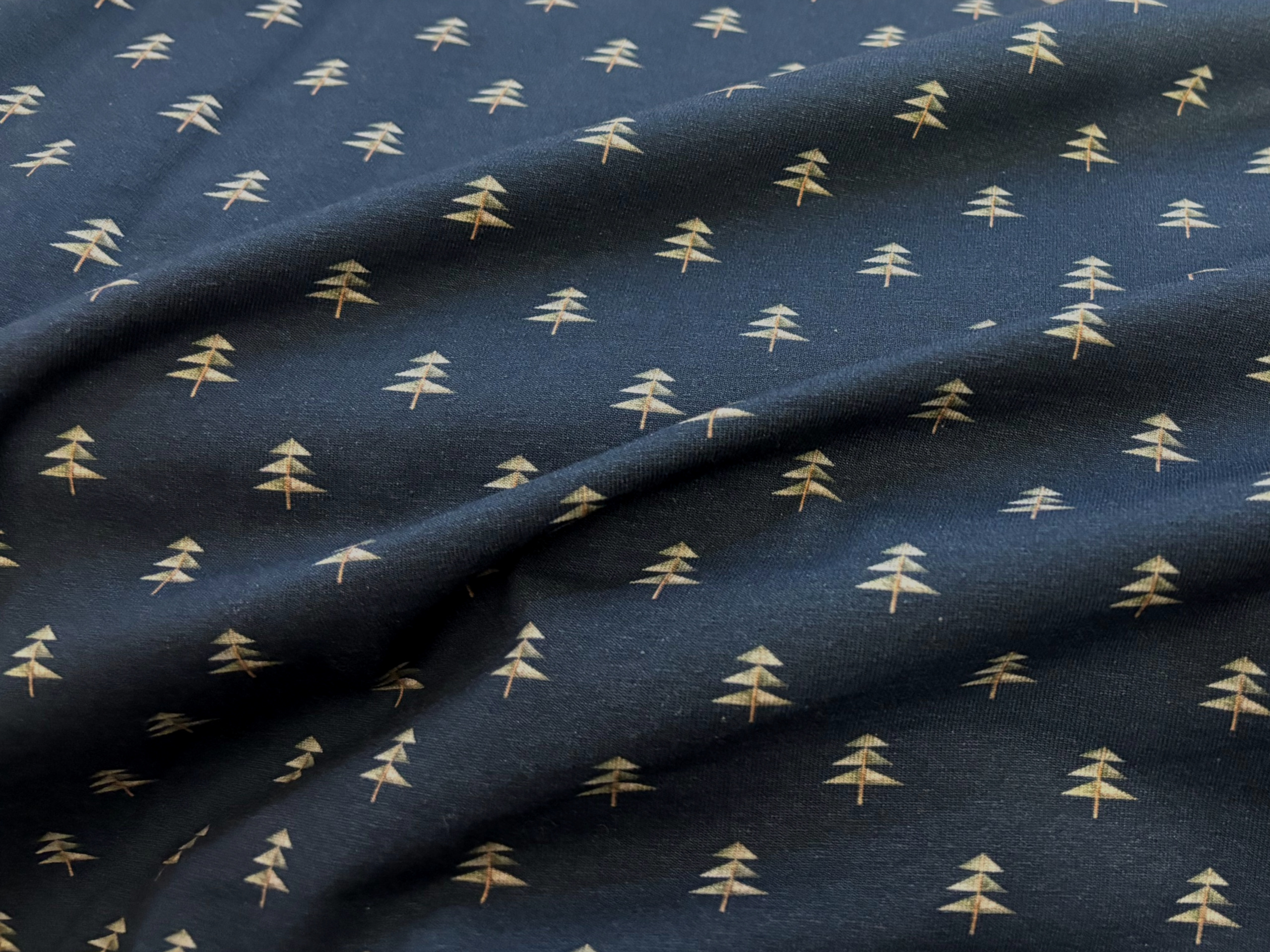 Kleingemusterter, petrolfarbener Jersey mit stilisiertenTannenbäumchen (1,5 cm) in Grün. 95% Baumwolle, 5% Elasthan 150 cm breit.