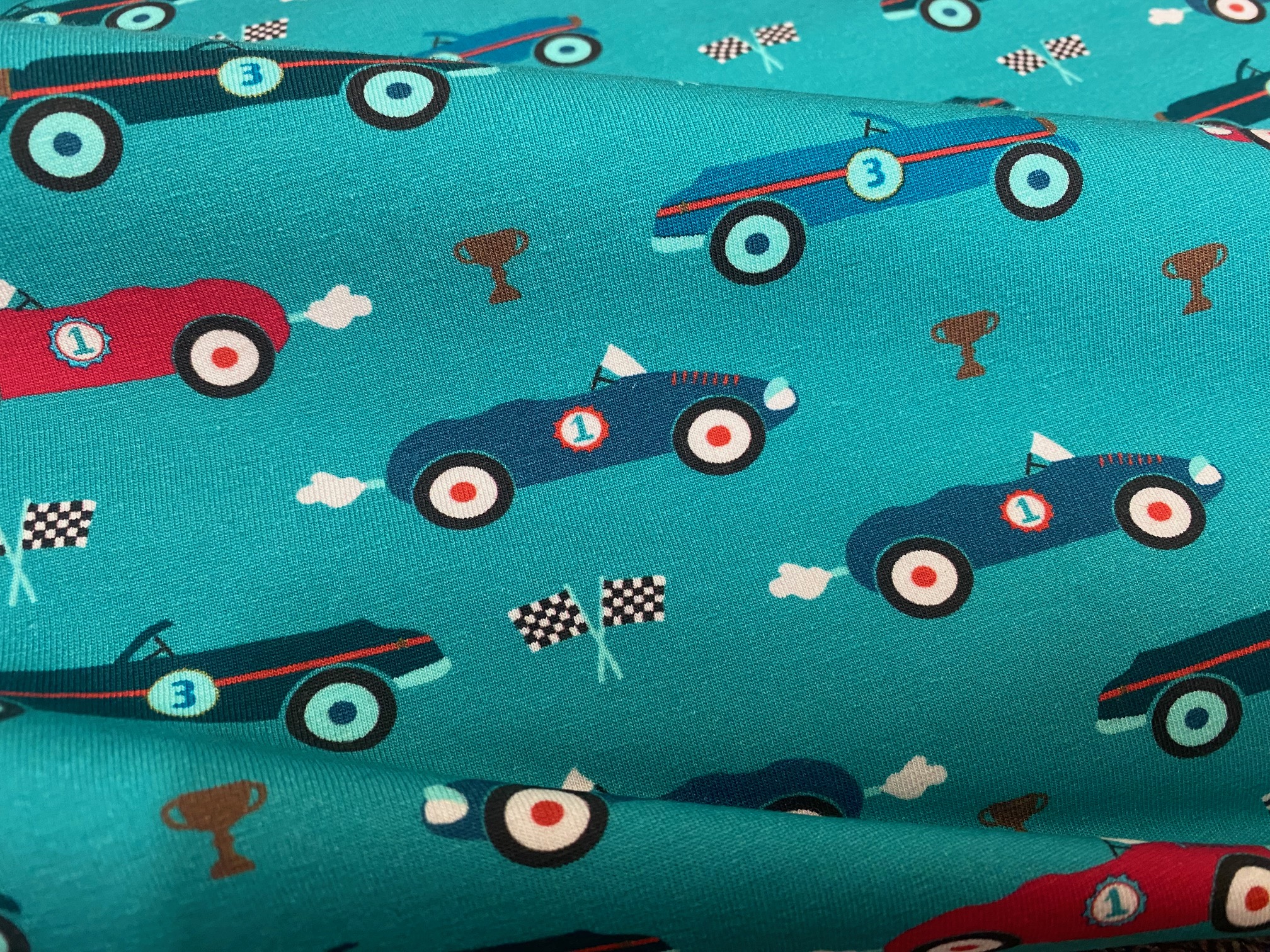 Hier kommen die Retro-Racingcars (6 cm breit) in coolen Farben und schönem Design. Dunkelblau und Knallrot mit Weiß auf Mint. Freches Motiv . Für Kindersachen, Shirts und mehr. 95% Baumwolle, 5% Elasthan, 160 cm breit. Schön weiche Avalana-Qualtät.
