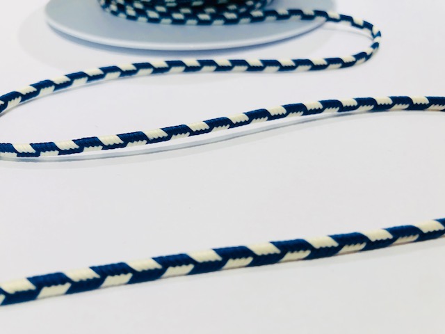 Strapazierfähige Polyesterkordel, 4 mm, mit schönem Muster in Blau/Weiß. Schafft dekorative Momente, toll auch für Turnbeutel, Rucksäcke und vieles mehr. Meterware, 100% Polyester, waschbar. Auch in anderen Farben erhältlich.