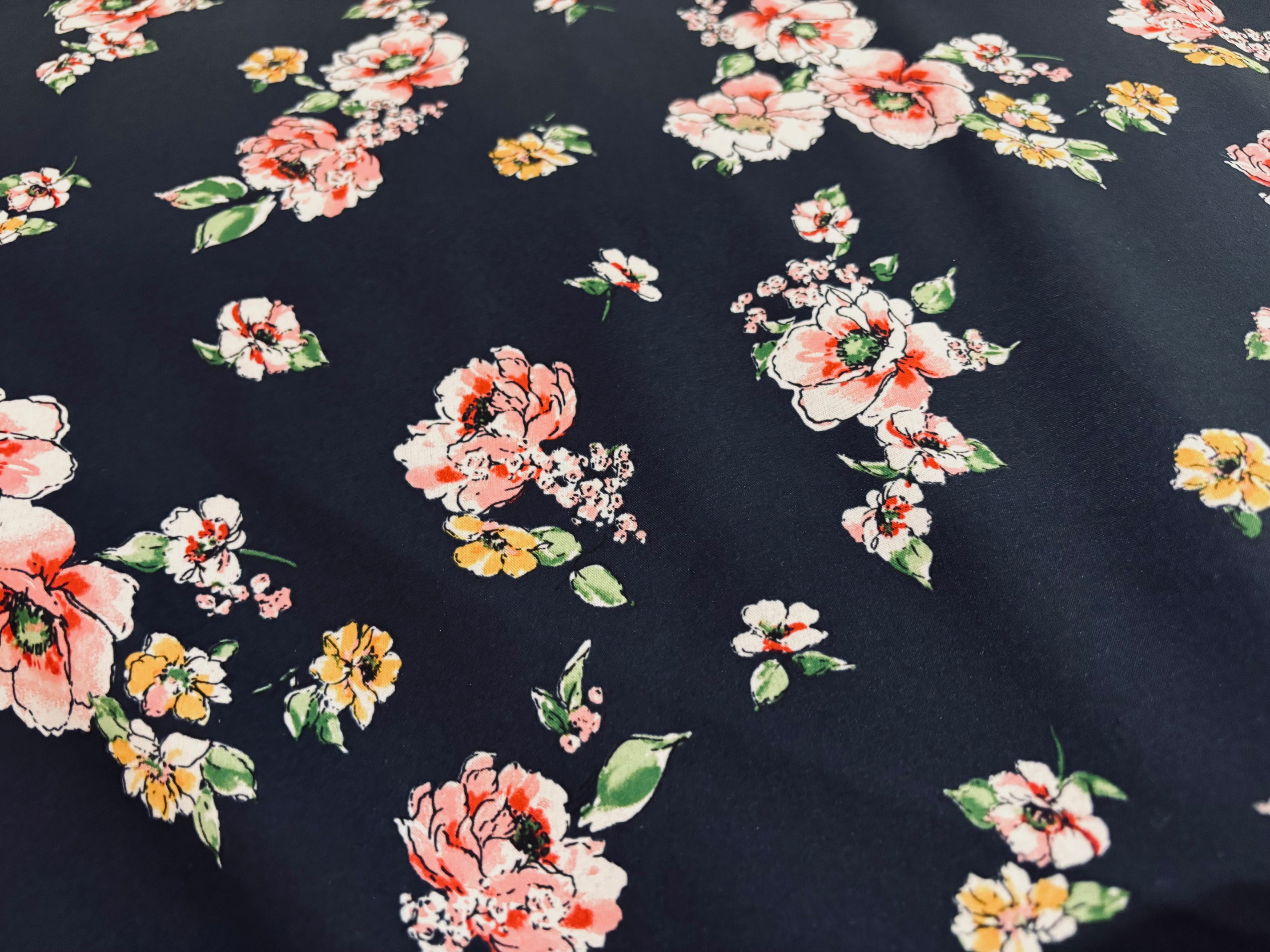Klassisch romantisch - Blumen in Rosa, Gelb, Weiß und Grün auf Nachtblau. Das Material: leicht, luftig und superlässig, Wie Viskose und mit ein bisschen Stretch und tollem Eyecatcherdesign. Super angenehm und kühlend auf der Haut. Für Sommerkleider, Blusen, leichte, weite Hosen, Röcke und mehr. 95% Polyester, 5% Elasthan, 147 cm breit. 90 g/m.²