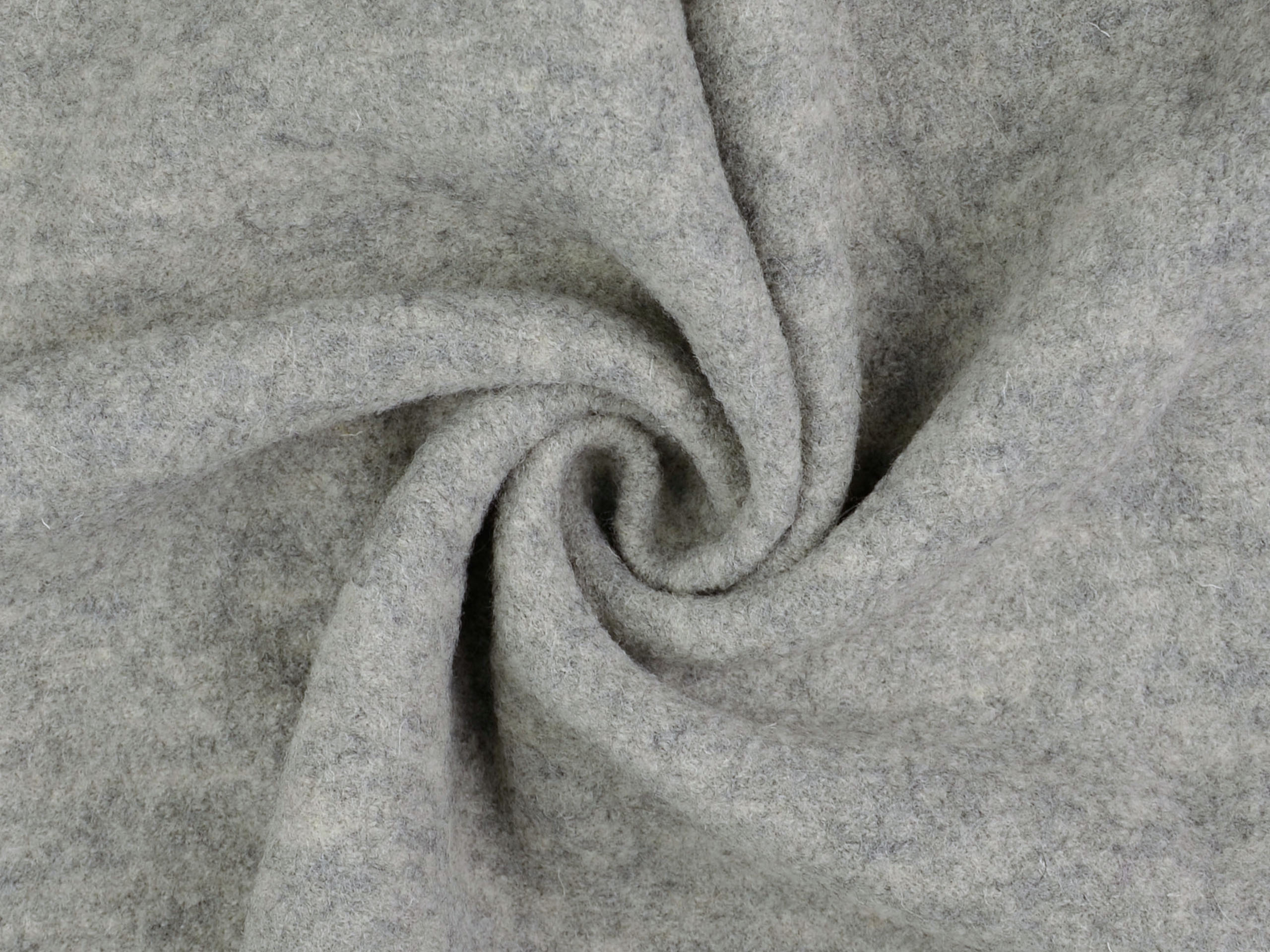 Wärmender Merino-Walk in klassischem Hellgrau meliert. Aus 100% Merino Schurwolle. 145 cm breit, 260 gr/m². Merinofasern sind nur halb so dick wie herkömmliche Schurwolle. Das Material ist weicher, feiner als normaler Walkstoff, und vor allem im direkten Hautkontakt, wie bei Mützen oder Loops, noch trageangenehmer. Für alle, die ein etwas leichteres Material für Oberteile, Walkoveralls, Jacken, Mützen, Schals suchen! Mulesingfrei!