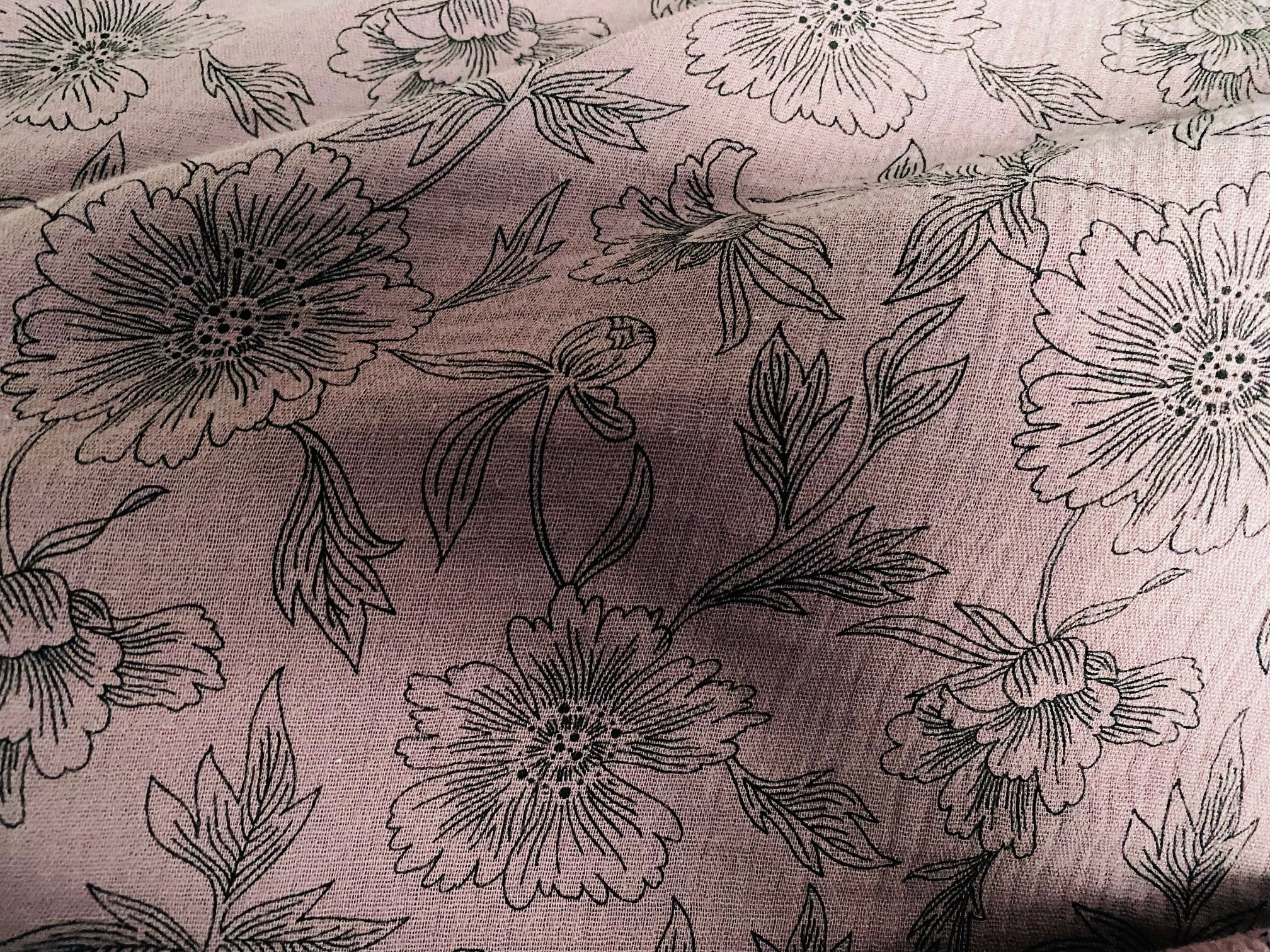 Baumwoll-Musselin/Doppelgauze in schönem Altrosa mit Blumen in Schwarz. Für Kindersachen, Loops, modische Teile und sogar Blusen und Kleider. 100% Baumwolle, 135 cm breit.