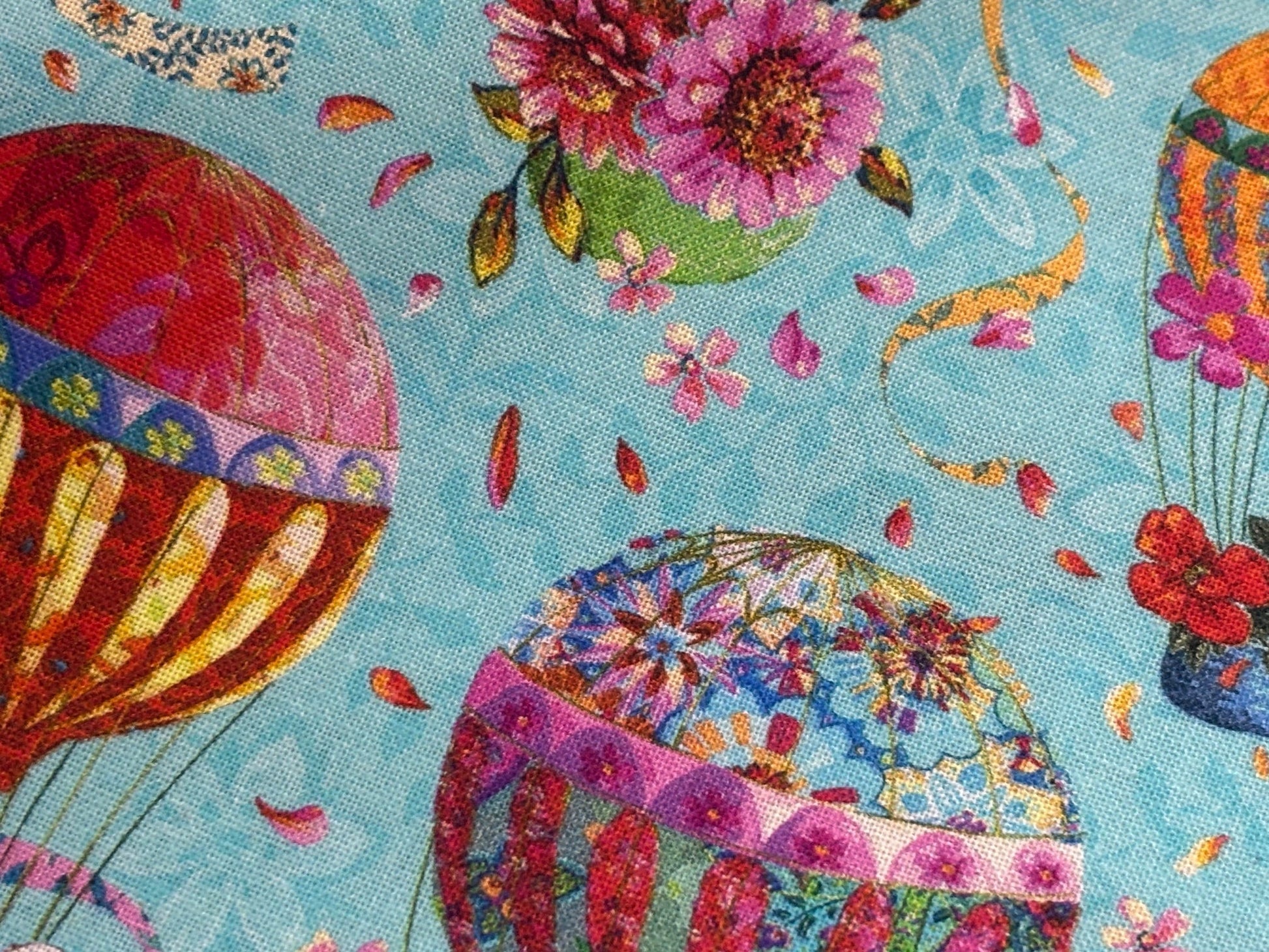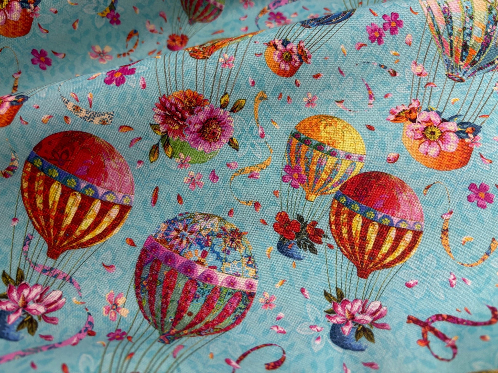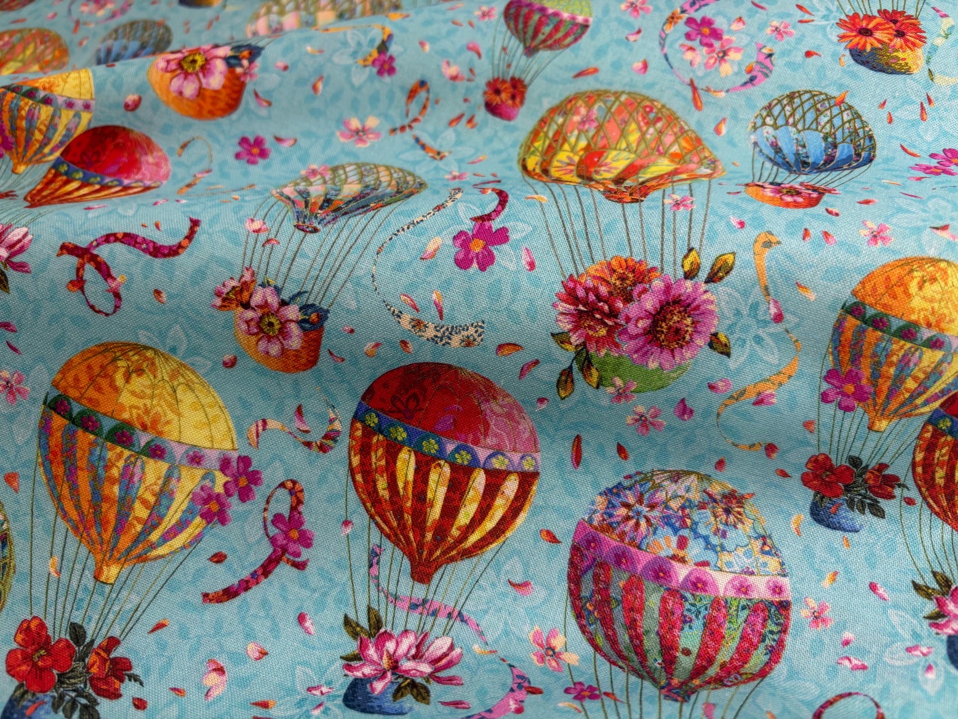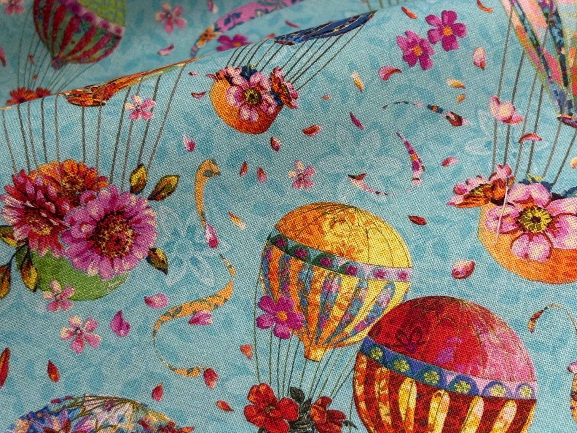 Kunterbunte Fesselballons schweben durch die Lüfte. Bezaubernd romantisches Stoffdesign von Odile Bailloeul. Ballons in leuchtenden Farben mit Blüten vor türkisblauem Himmel. Atemberaubend schön und sehr besonders. Ein Stoffdesign für außergewöhnliche Kreationen, Heimtextilien, Modeaccessoires, Patchwork- und Quiltdecken und mehr. Free Spirit. 100% Baumwolle, 110 cm breit