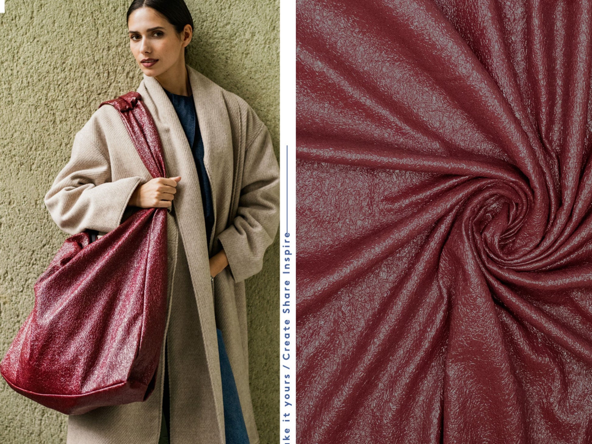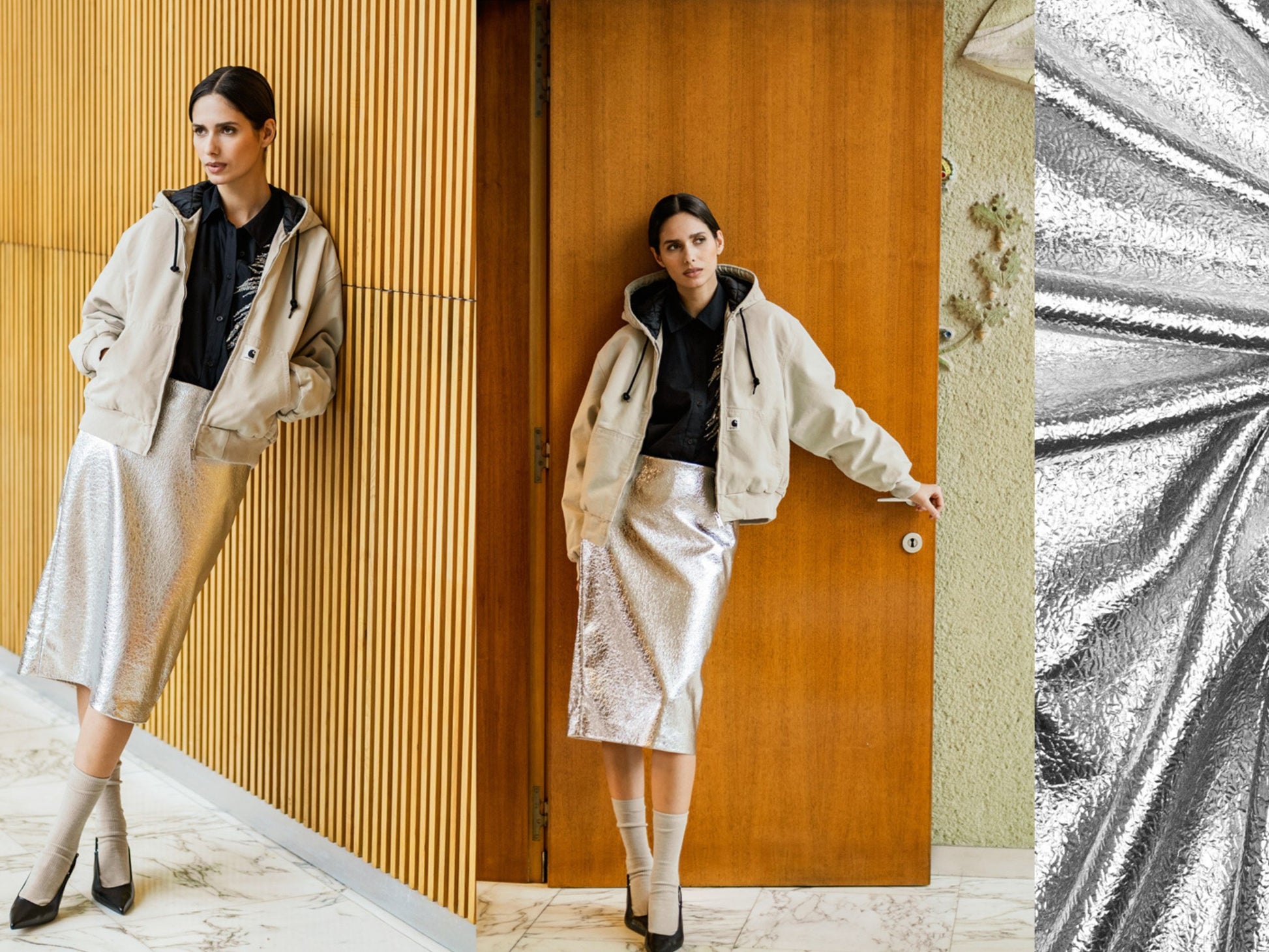 Silver Shining! Cooles Material, zum Beispiel für Jacken, Mäntel oder Taschen. Foilierter Fleecestoff, gecrusht. Superstylish! In Silber, innen weich, außen Kunstlederlook used. Aus der Fibre Mood Collection. Tipp: Fibre Mood Nähmagazin No. 36, Rock MIREYA, Mantel - Schnitt ESME, 100% Polyester, 140 cm breit, 300 g/m².