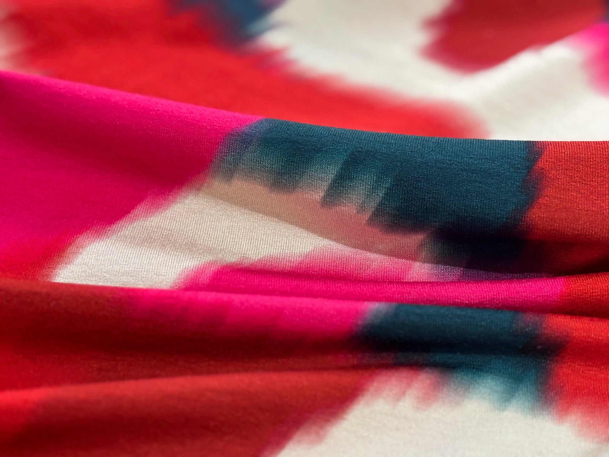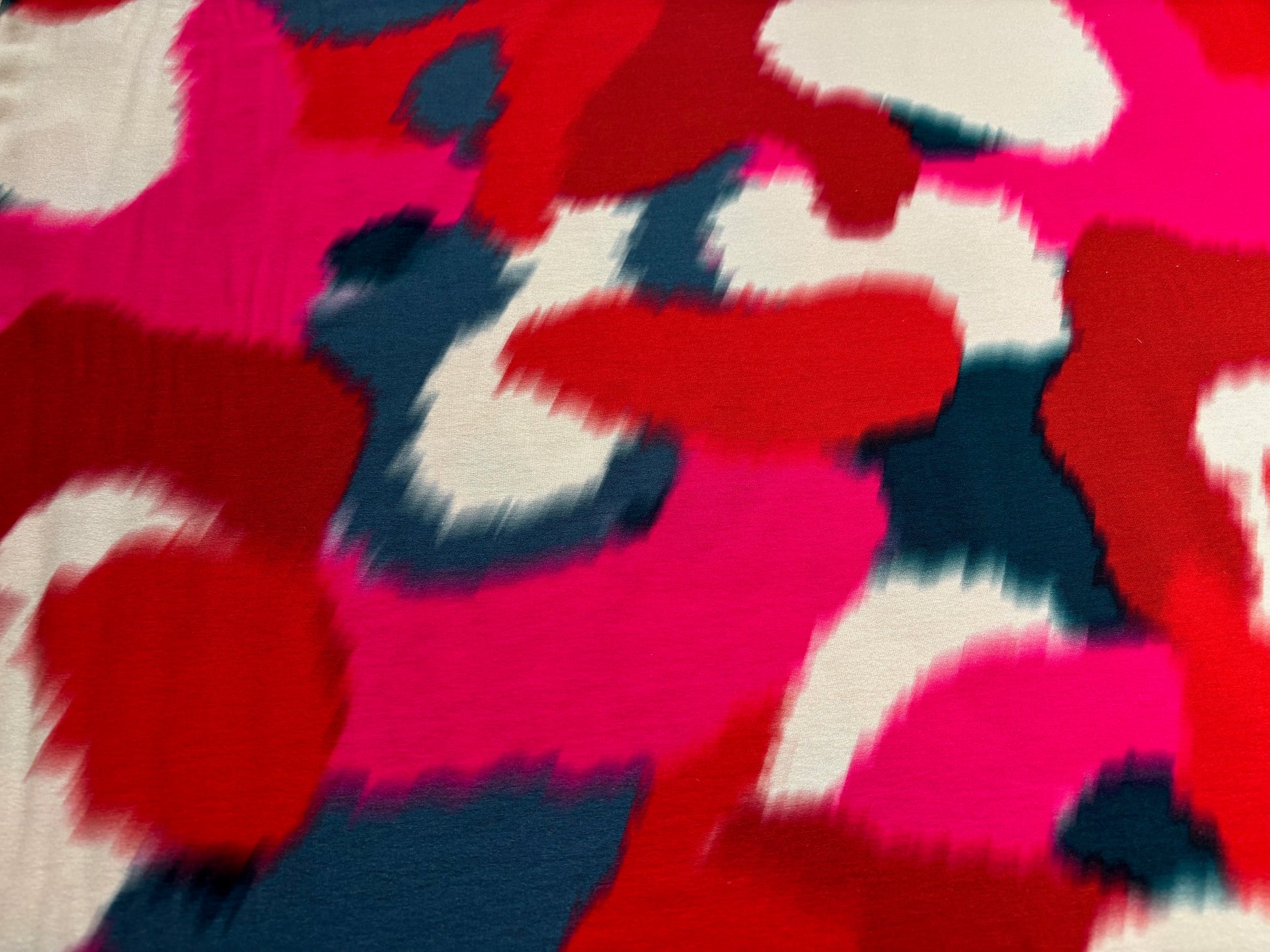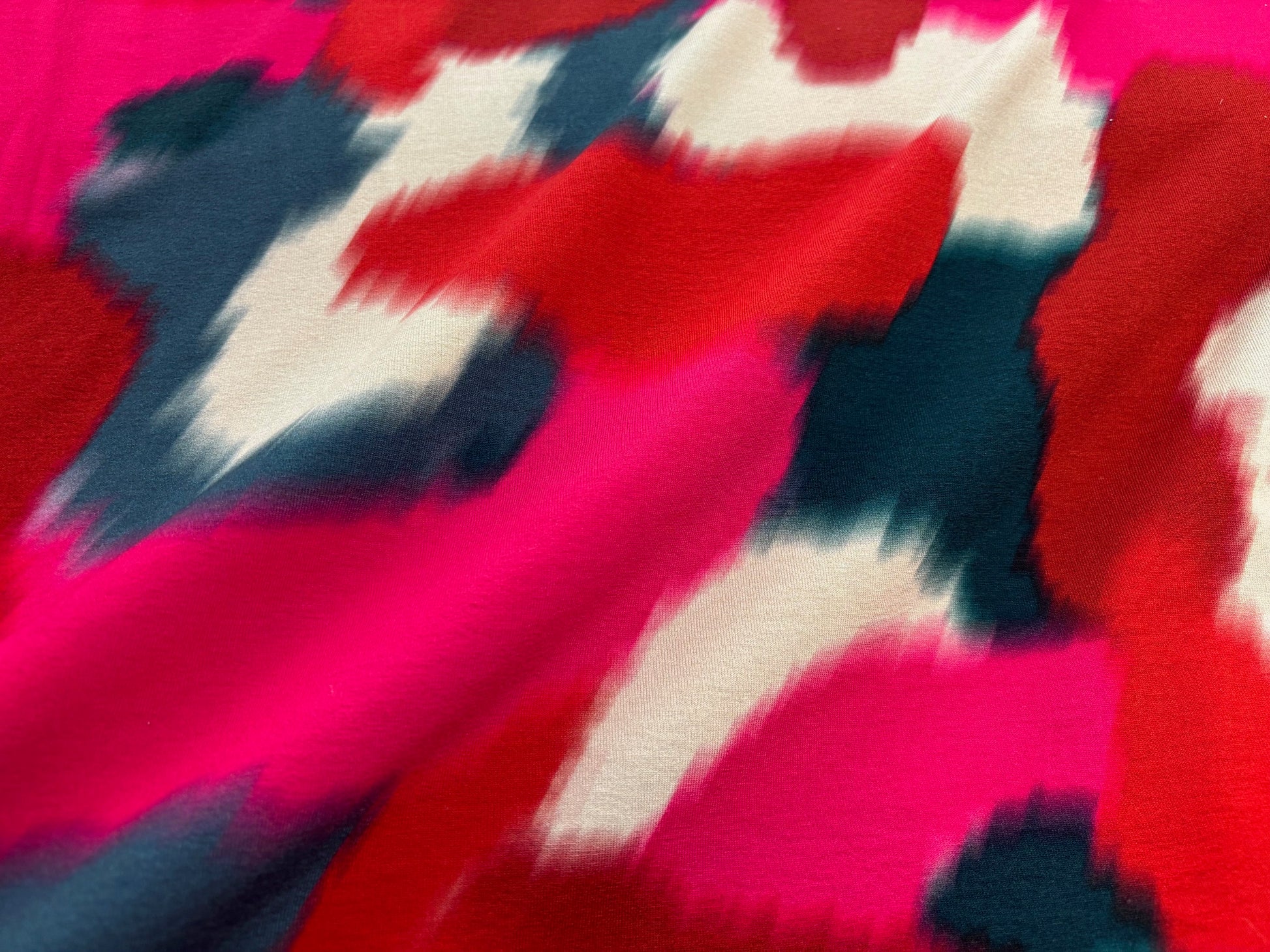 Eyecatching! Attraktives grafisches Muster in einem Mix aus leuchtenden Pink, strahlendem Rot, dezentem Petrol und Natur. Verwischter, aquarellartiger Style, tolle Fernwirkung. Das Material zeichnet sich aus durch einen schweren, tollen Fall. Ideal für ein Kleid, einen Rock, eine lässige Hose oder ein Oberteil. Auch für ein Shirt mit Wasserfallkragen super geeignet. 95% Viskose, 5% Elasthan, 180 g/m², 150 cm breit. Gleich zum Smilla Jerseykurs oder Kleidkurs anmelden!