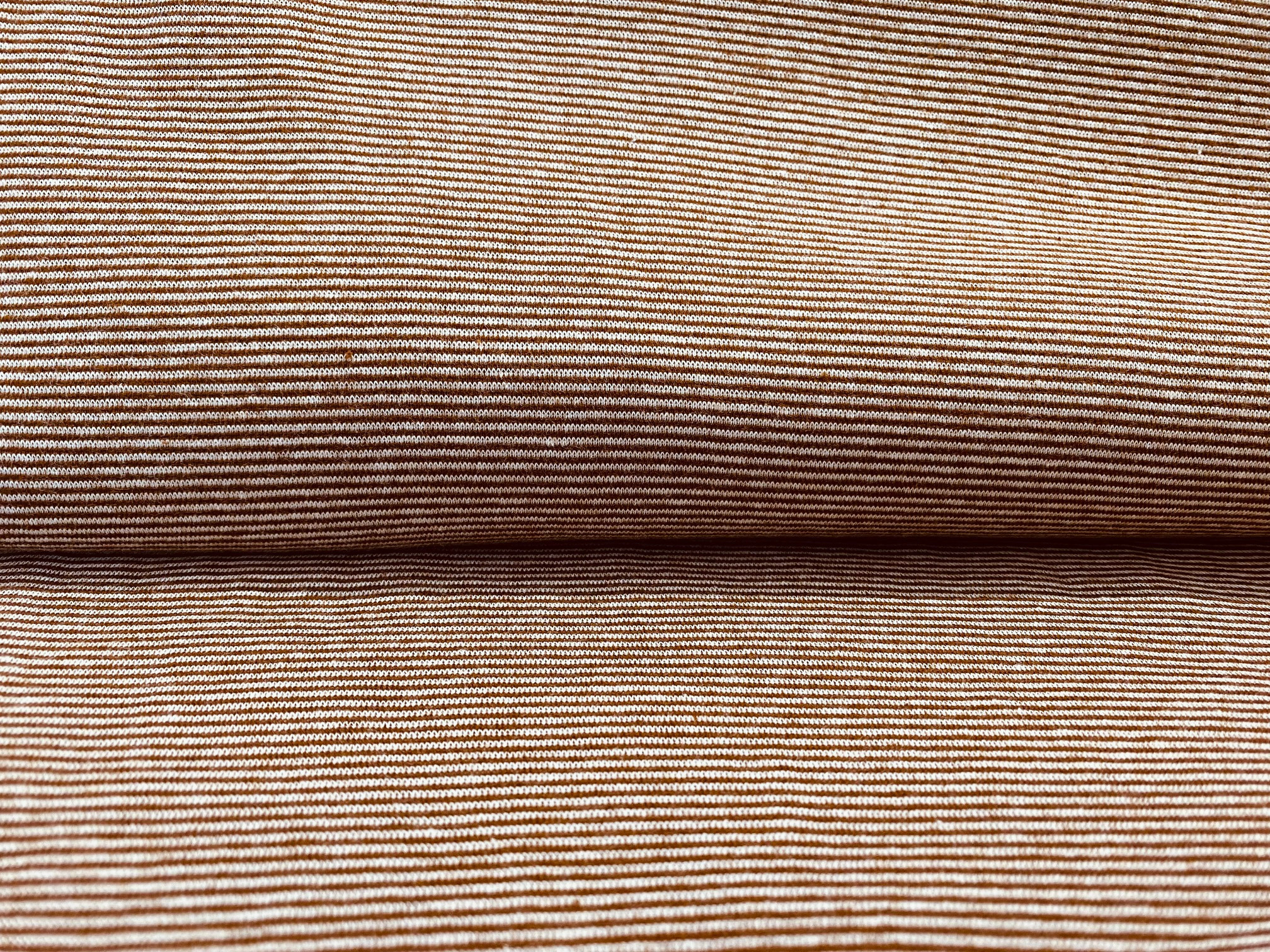 Fein gestreiftes Bündchen in Braun und Beige, 95% Baumwolle, 5% Elasthan, 70 cm breit (35cm breiter Schlauch). Für Bündchen am Ärmel, Kragen und Saum. Schön elastisch und langlebig. Oeko-Tex Standard 100 Product class I.