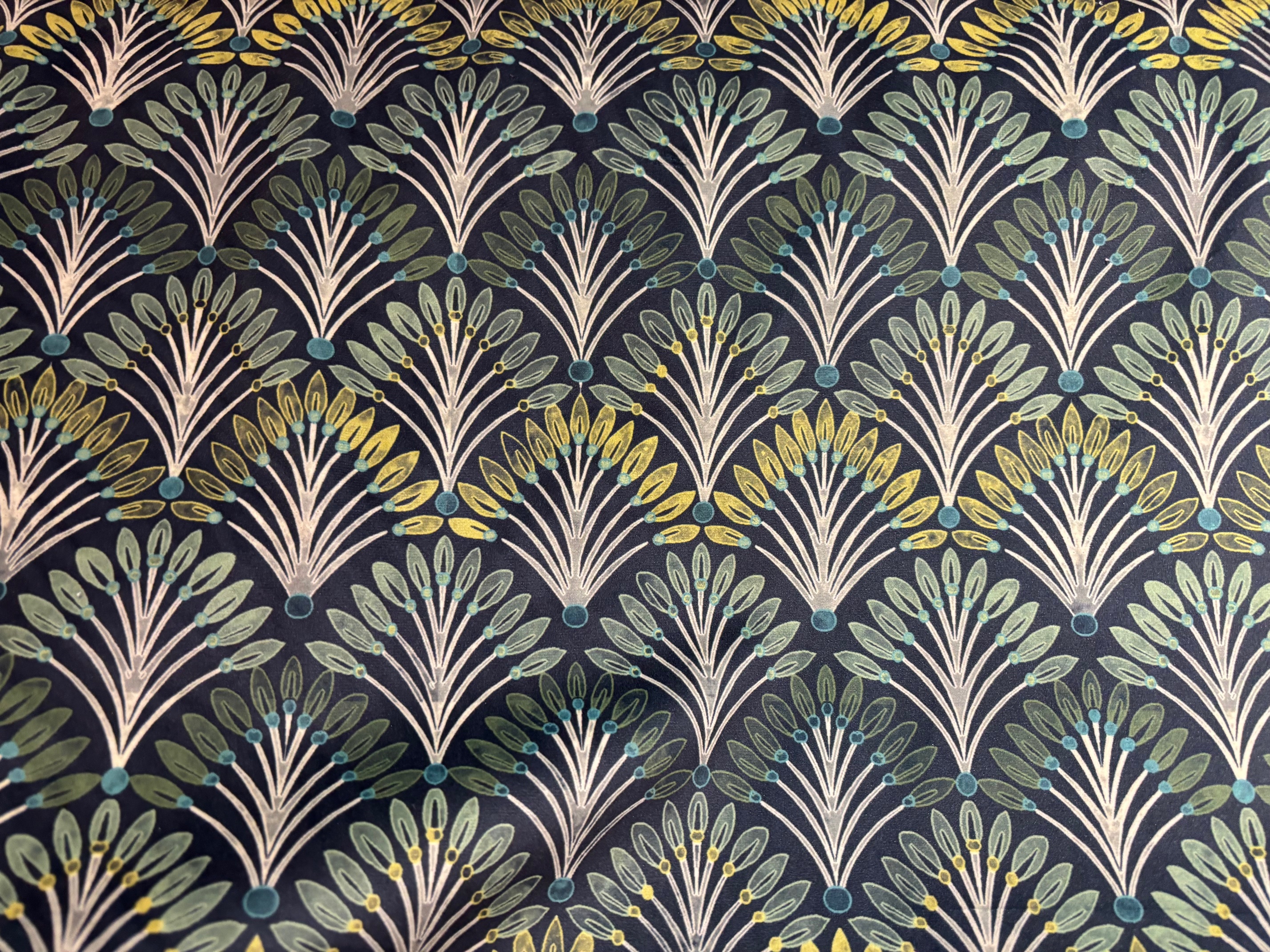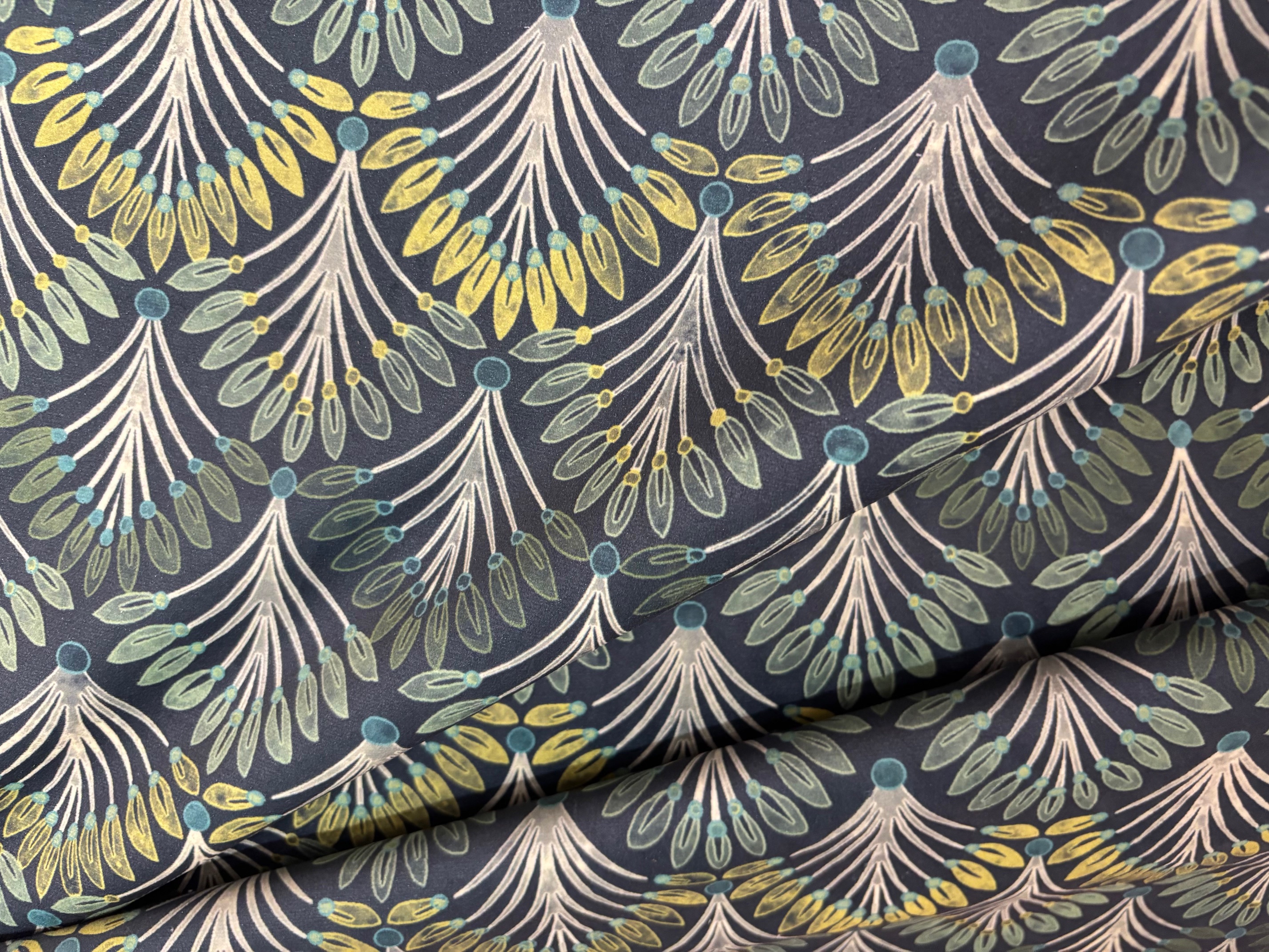 Farnartige Blätter (7 x 7 cm) im Rapport. In Grüntönen, akzentuiert mit Türkis und Gelb, auf sehr dunklem, super edlem Blau. Samtige, schimmernde Oberfläche, streichelzarter Verloursamt, streichelzart. Superschön als Vorhang, Kissenbezug, Polsterbezug, Taschen u.v.m. 100% Polyester, 220 g/m ² , 140 cm breit. Waschbar 30°.
