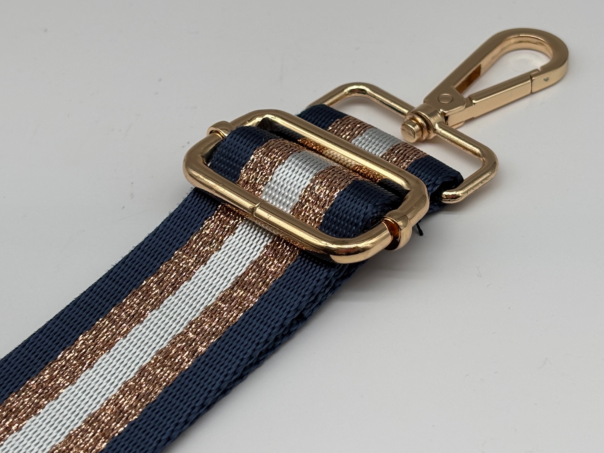 Fertiges Gurtband gestreift, in Dunkelblau, Weiß und Kupfer metallic, 40 mm breit. Konfektioniert mit einem Längenversteller und zwei Karabiner in Roségold. Edler Look. Macht aus jeder Tasche ein modisches Highlight. Strapazierbar, 100& Polyester. Justierbar auf eine Länge von 75 - 135 cm.