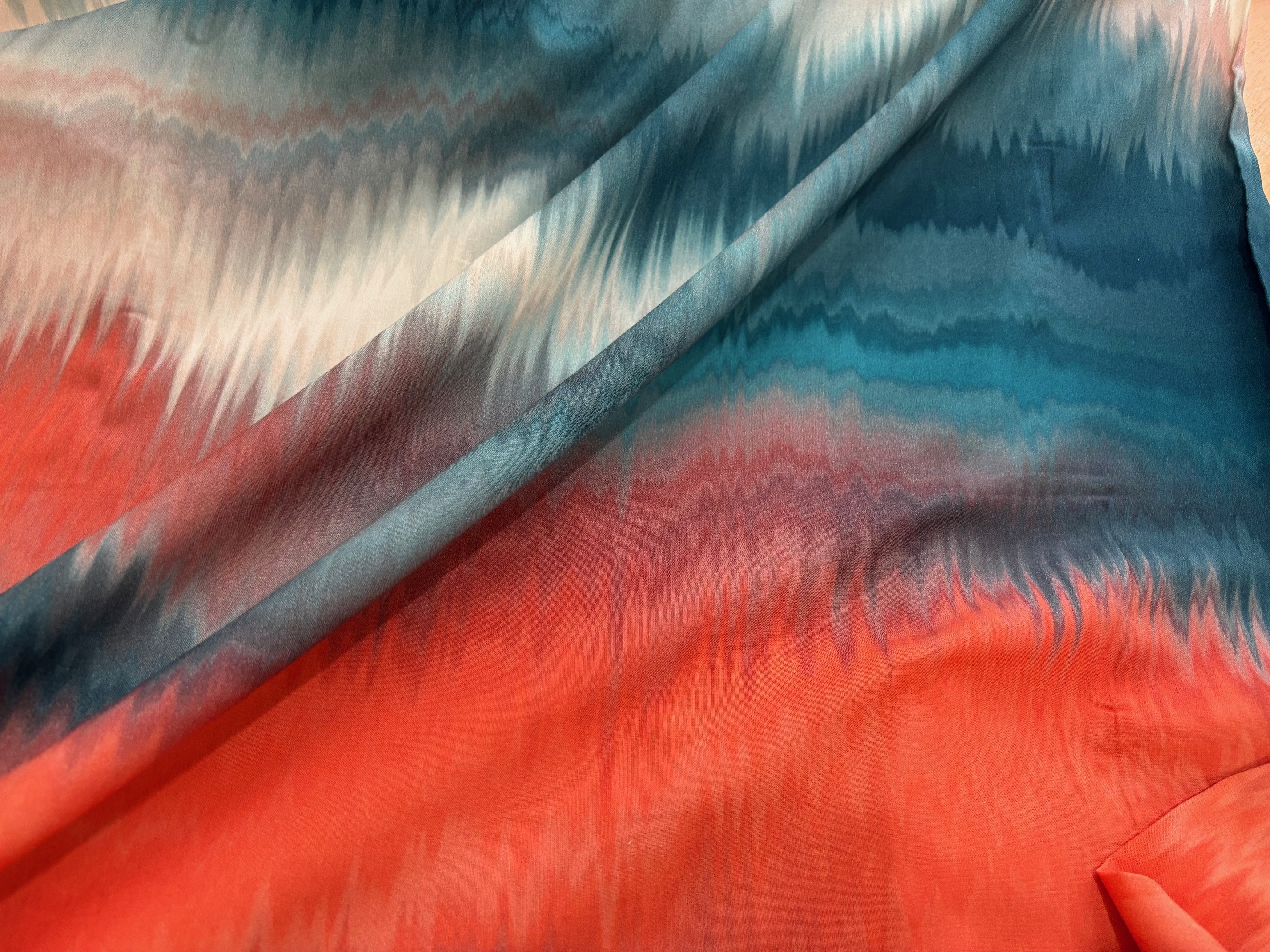 Fließend weiche Viskose mit traumhaften Farbverläufen im Batik-Look. Von rauchigem Graublau über leuchtendem Koralle zu dezentem Naturweiß. Spektakuläre Fernwirkung, Top Material für Dein Sommekleid, Deine Bluse, Deinen flatterndenRock oder Deine Hose. 100% Viskose, 150 cm breit.