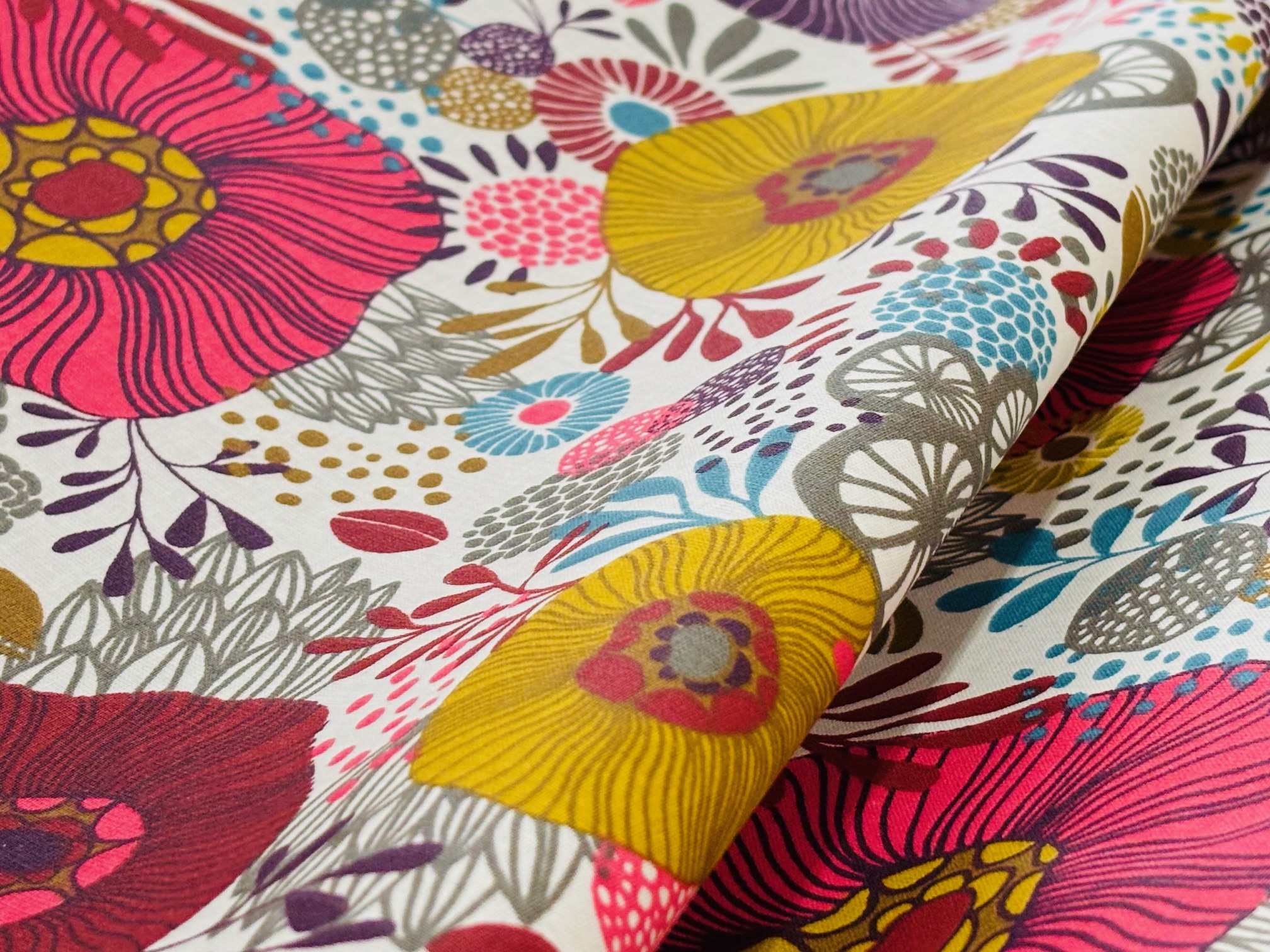 Schraffierte, gemusterte Blüten in Pink, Violett und Senfgelb mit vielen kunterbunten Blättern, ein echtes Traummotiv zum Eintauchen. Laminierte Baumwolle mit einer 2-fach Acrybeschichtung. Abwischbar und waschbar, lebensmittelecht. Auch für Lunchbags verwendbar. 155 cm breit.