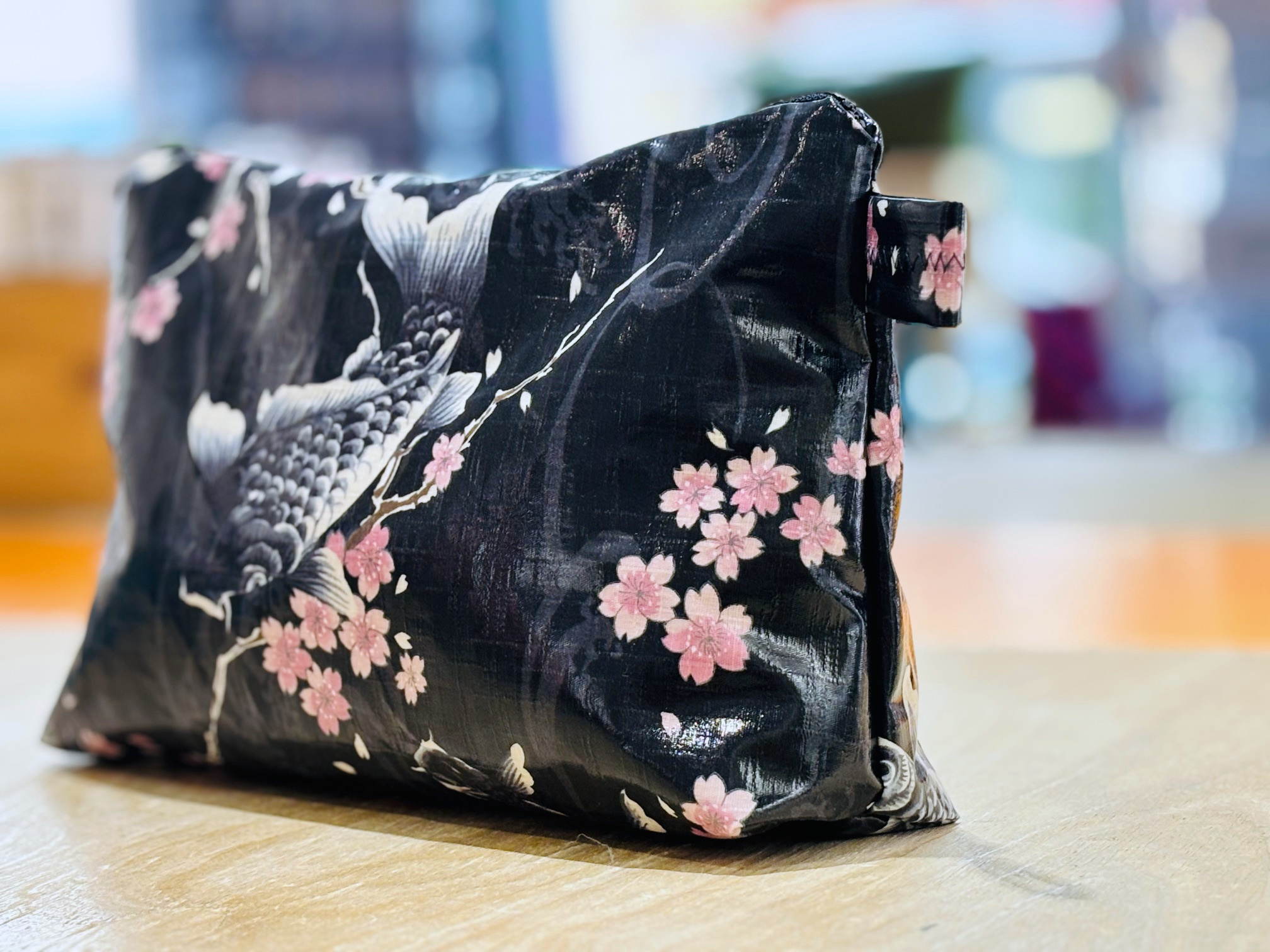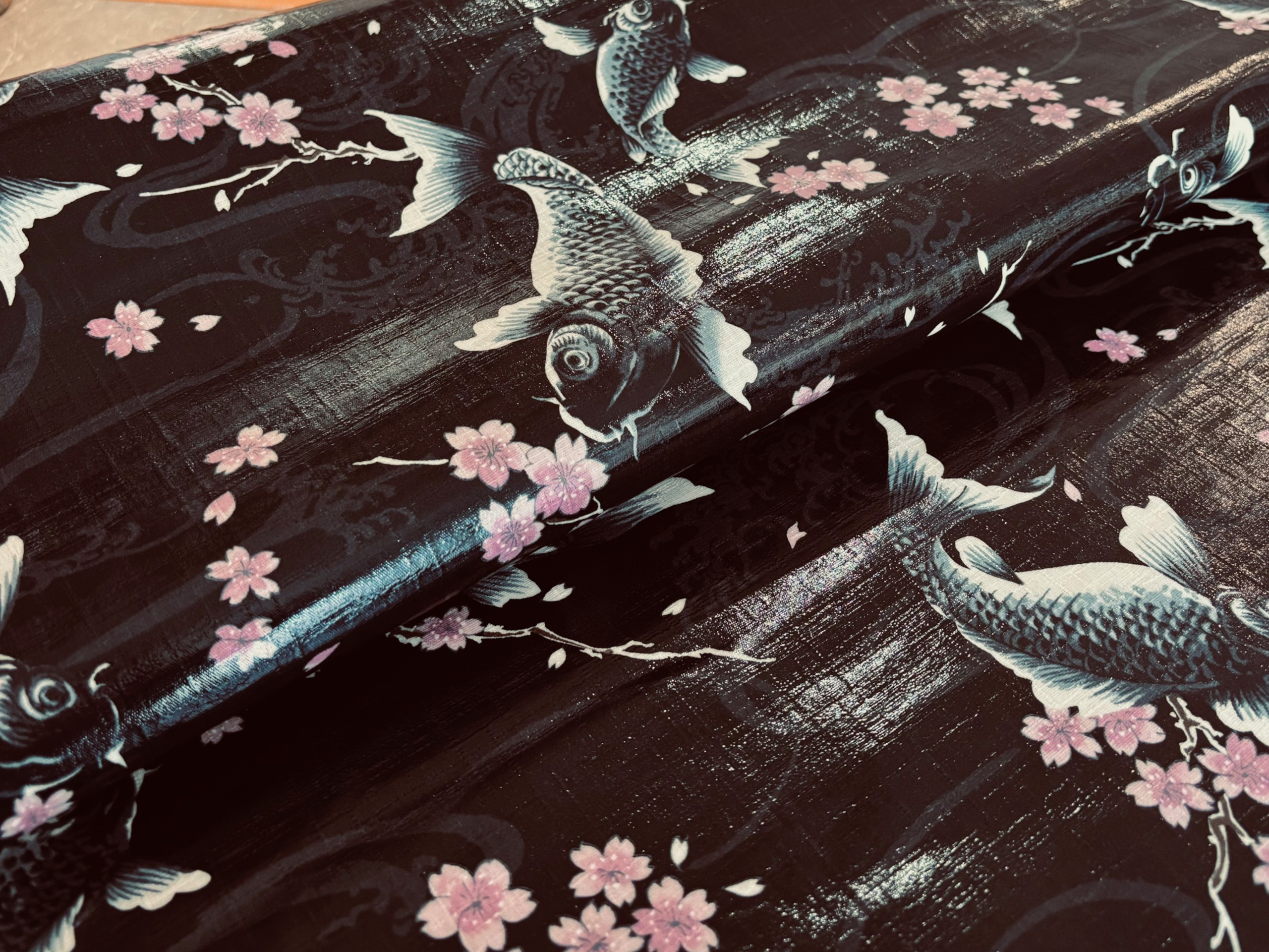 Ein Traum! Echino Wachstuch mit großen Kois (8 x 14 cm) in coolem Schwarz mit rosafarbenen Kirschblüten. Asiatische Anmutung. KOKKA, made in Japan. Untergrund mit leinenartiger Optik. Festere, strapazierfähiger Qualität, matt folienlaminiertes Baumwoll/Leinengemisch. Unverwüstlich und wunderschön für Taschen, Tischdecken, Tablethüllen und vieles mehr. Made in Japan.45% Baumwolle, 55% Leinen, 110 cm breit, laminiert.