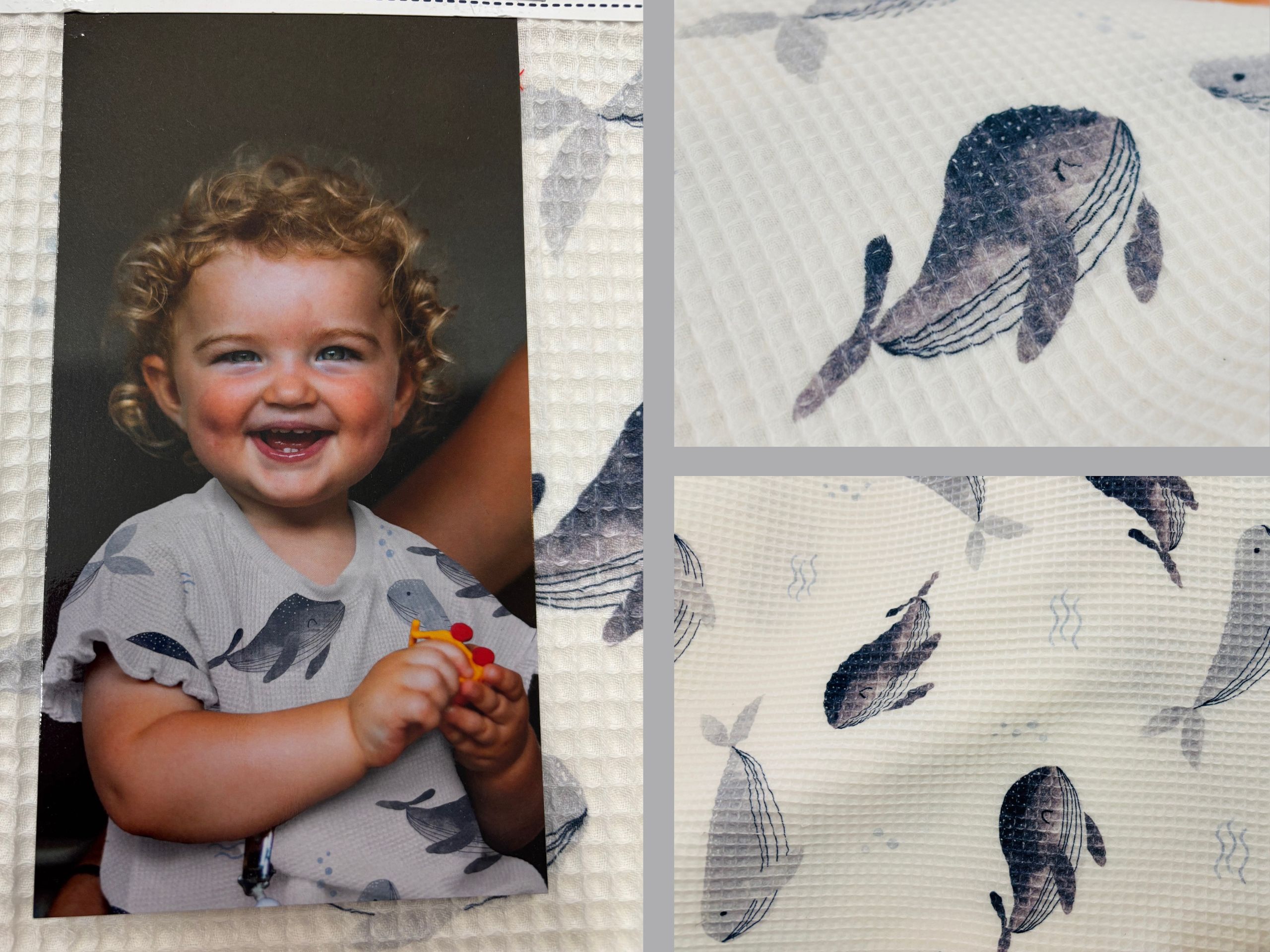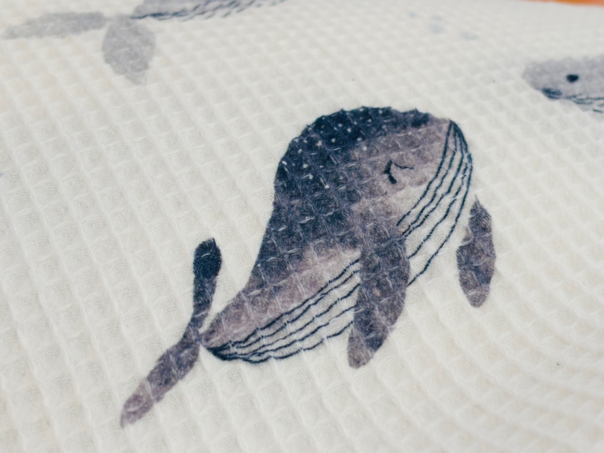 Oh wie süß! Grau und blaue Wale (13 cm breit) in den Wellen. Weißes Waffelpique aus 100% Baumwolle. Schön weich und angenehm auf der Haut, für Baby- udn Kindersachen, Bademäntel, Handtücher, Accessoires und Heimtextilien. Vielseitig mit anderen Baumwollstoffen kombinierbar. 100% Baumwolle, 133 cm breit.