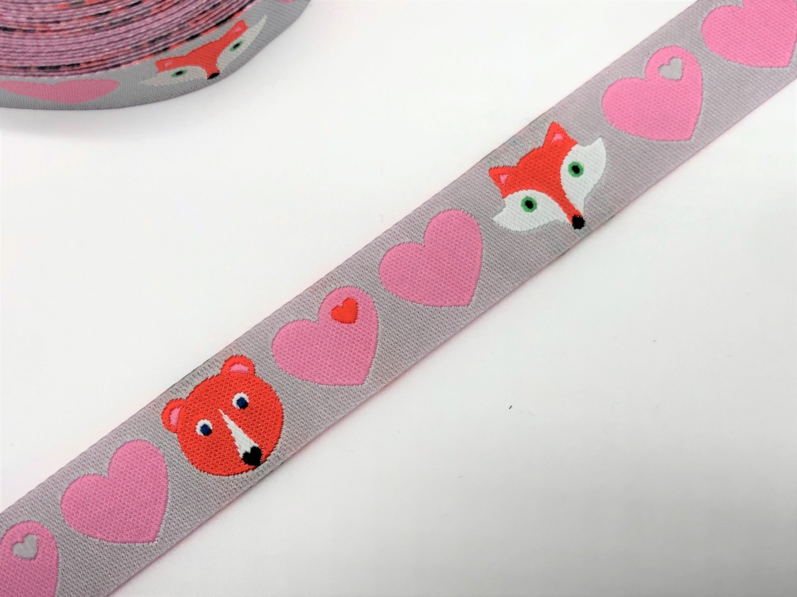 15 mm breites Webband mit Bären, Füchsen und Herzen. Dieses süße Band aus 100% Oekotex Standard 100 zertifizierten Polyester eignet sich perfekt zum Verzieren von Taschen, Accessoires und Kinderkleidung.