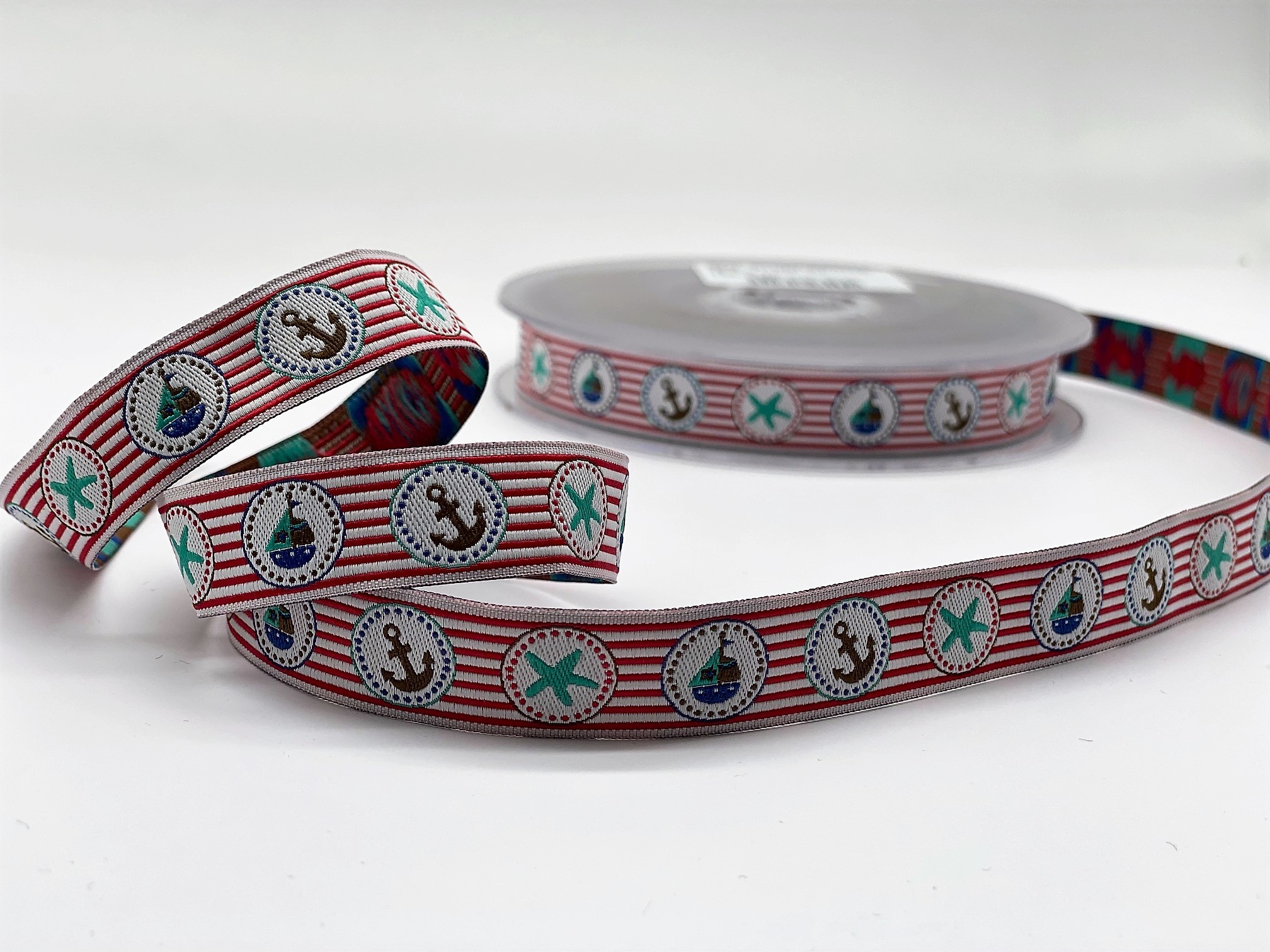 Marine - 15 mm breite, maritime Bordüre mit Anker, Seestern und Schiff in Bullaugen auf rot gestreiftem Untergrund. 100% Polyesterfaser. Jetzt geht's ans Meer!