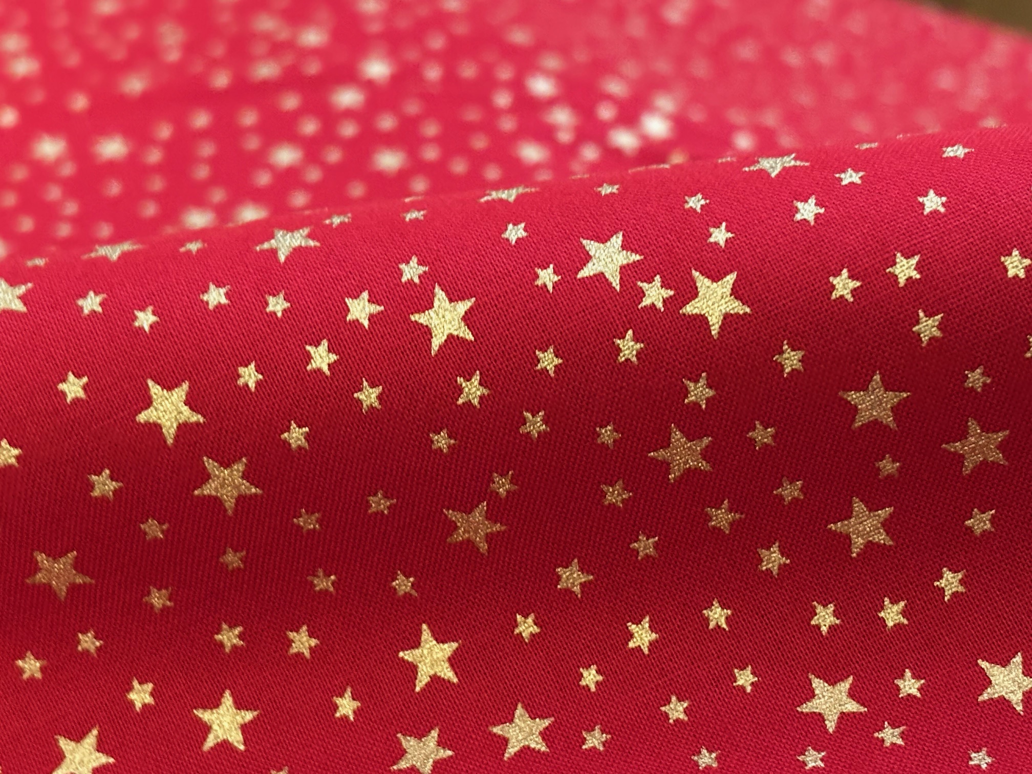 Golden glitzernde Sternchen auf leuchtendem Weihnachtsrot. Für Deine festlichen Kreationen und Dekorationen. 140 cm, 100% Baumwolle. 120 g/m²